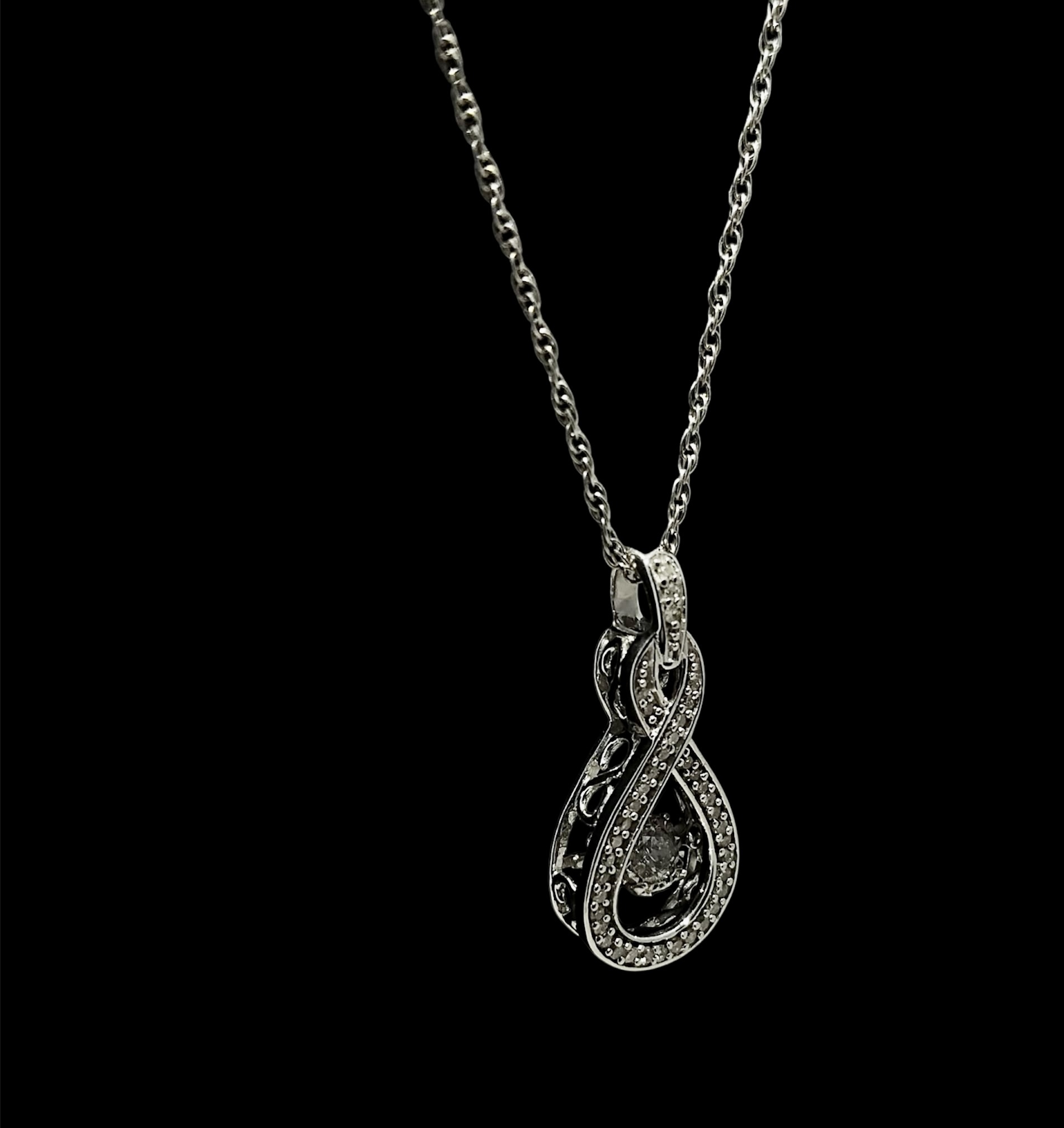 The sweeping contours are set with 1mm diamonds and ornamental infinity scrolls adorn the edges of the pendant.
