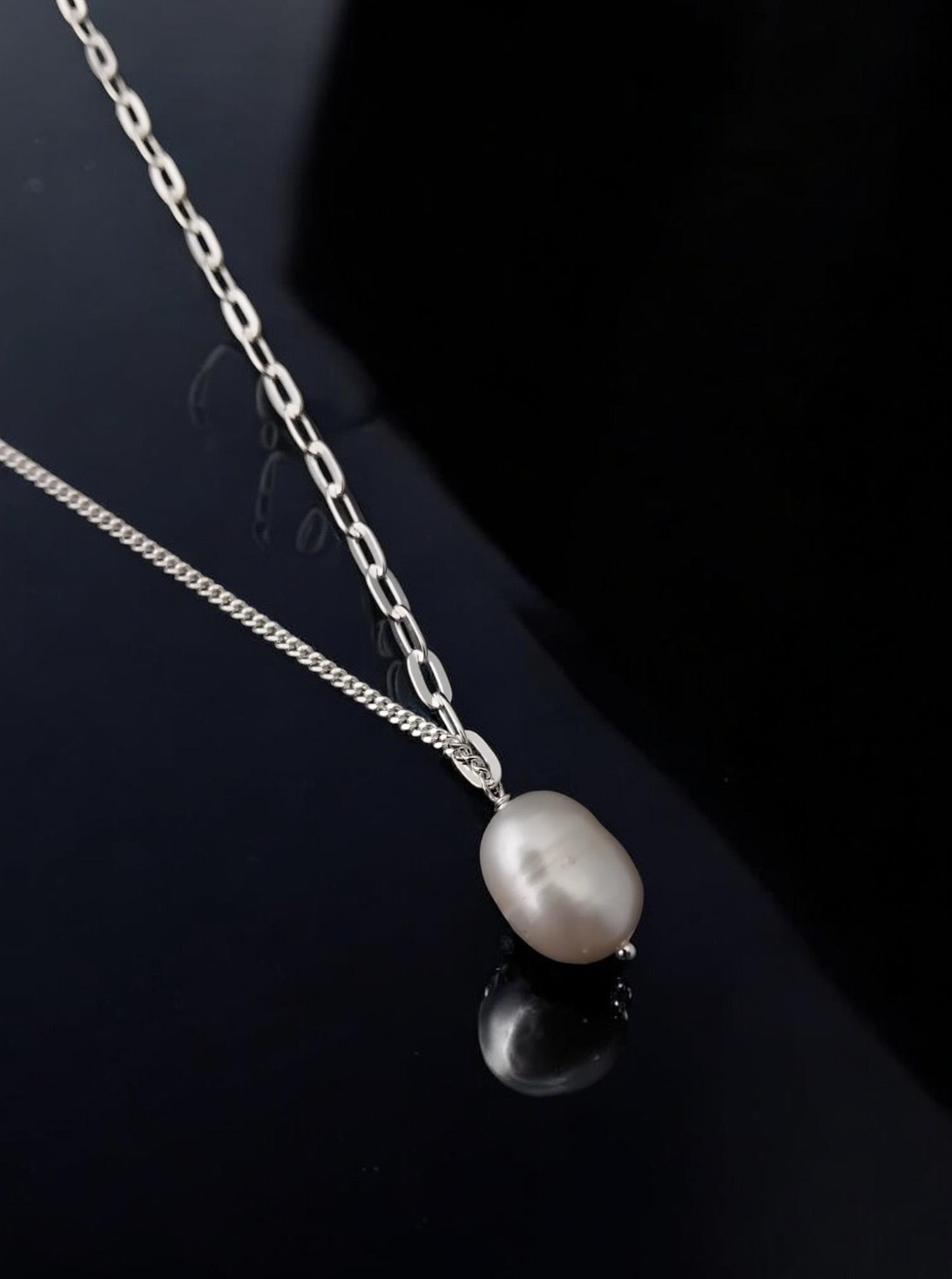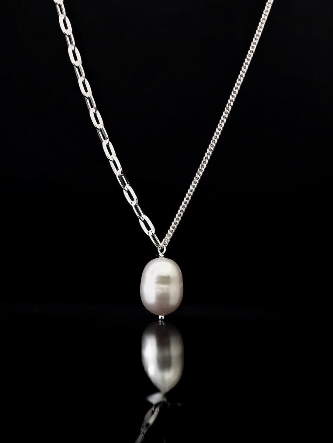 Asymmetric sterling silver chain is half paperclip and half diamond-cut curb chain.