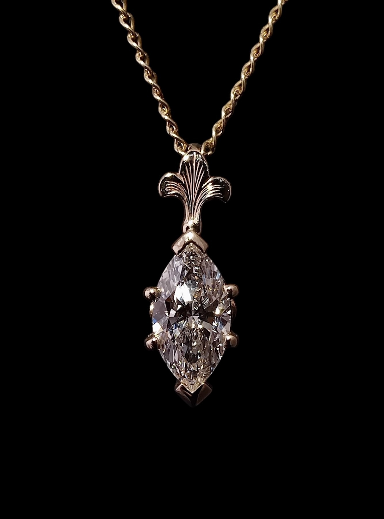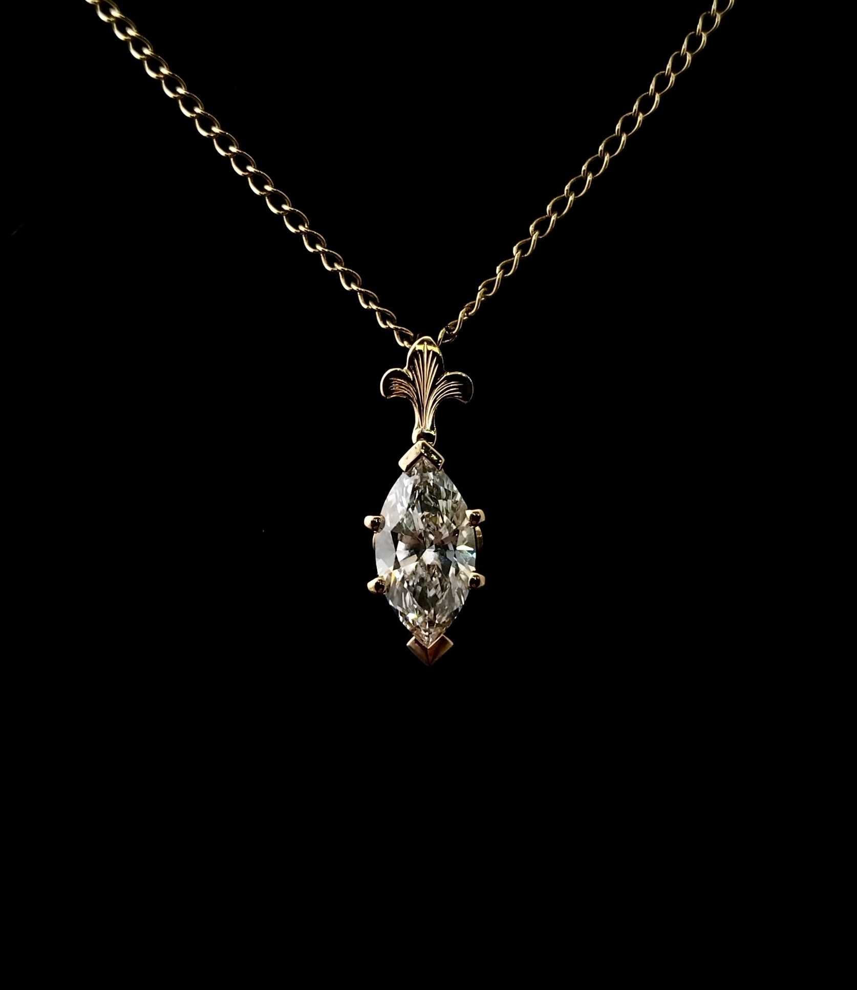 A 1.1ct certified marquise diamond is set in a secure, 6 claw setting, handcrafted from 9ct yellow gold at the heart of this pendant.
