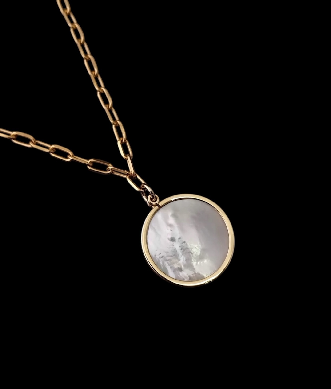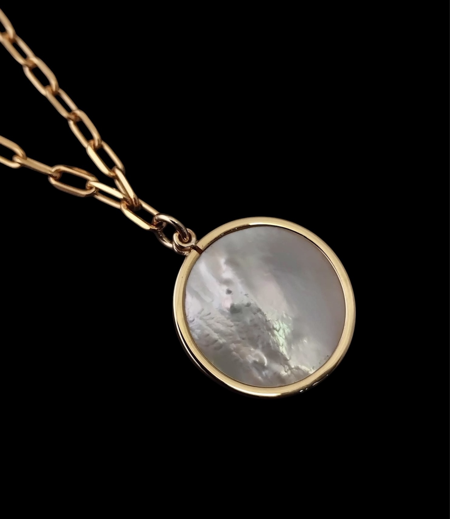 At the heart of the Luna sky pendant, a 9ct yellow gold bezel setting orbits a slice of hand-cut Mother of pearl. This protective setting shields the Mother of pearl from the impact of daily wear whilst the sleek lines and lustrous polish of the gold make this pendant feel like a contemporary, heritage piece.
