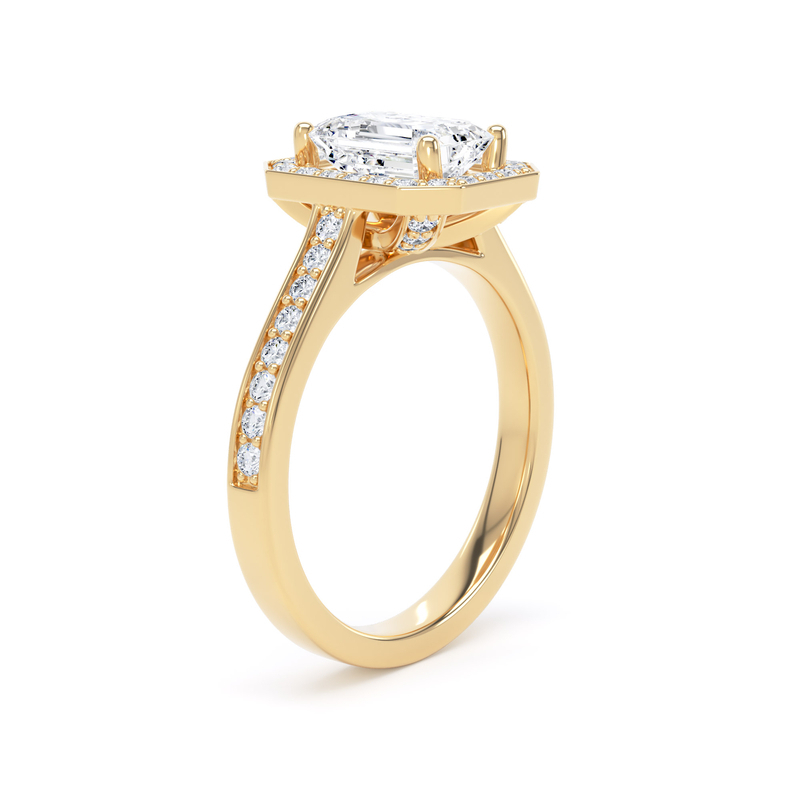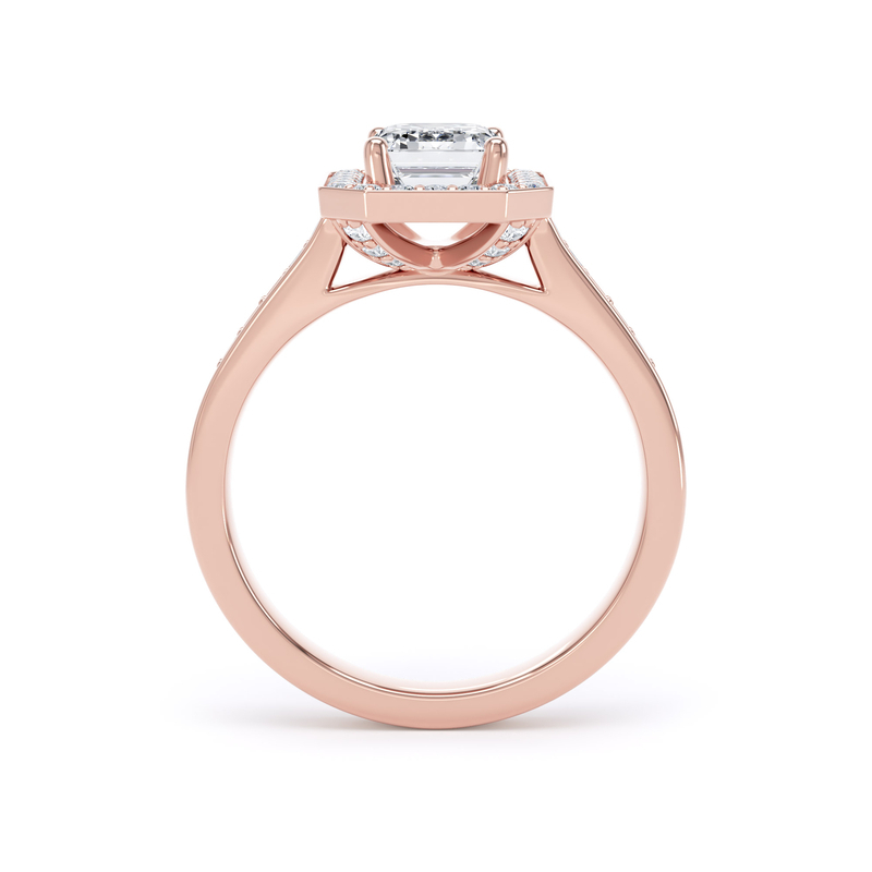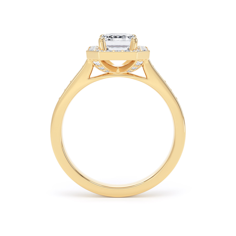 This emerald cut diamond halo has highly polished channel borders that offer a streamline and refined finish.