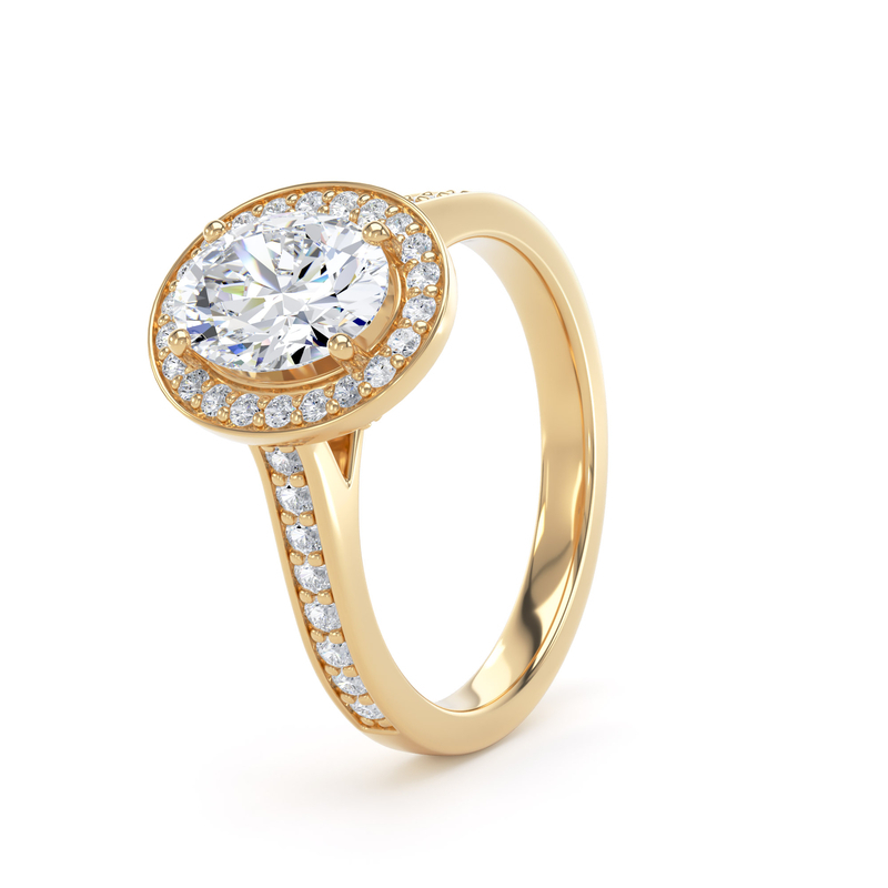 A 0.75 carat lab grown oval diamond is claw set at the heart of this engagement ring. It is surrounded by a halo of 22 sparkling diamonds. The shoulders are set with 16 diamonds total, 8 diamonds per side. The diamonds in the halo and the shoulders are claw set with protective, channel borders to shield them from the impact of daily wear.