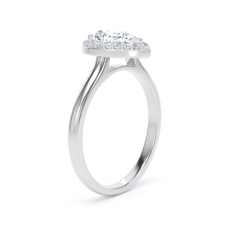 This sparkling diamond halo is set with a 0.40 carat natural pear shape diamond at the heart of the ring. It is surrounded by a halo of 20 round brilliant-cut claw set diamonds.