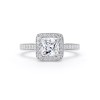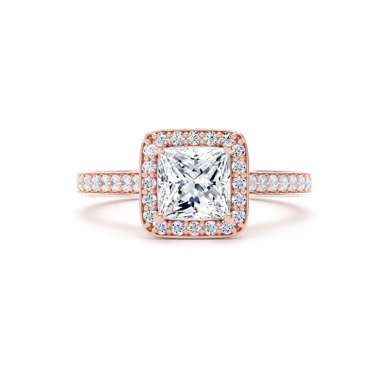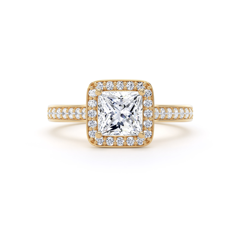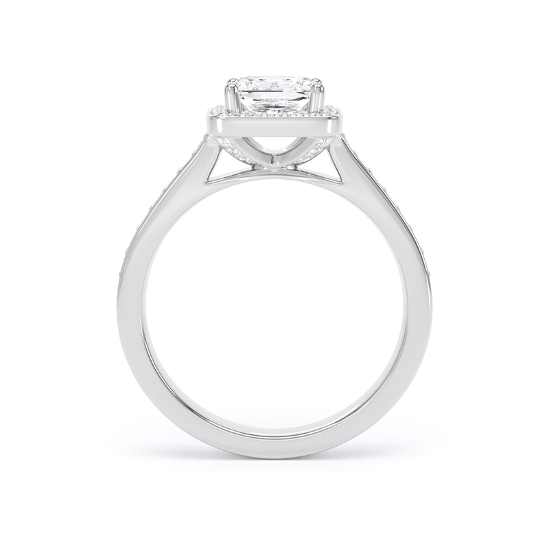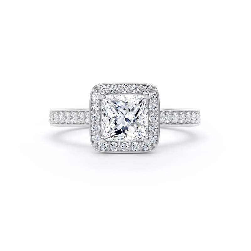 This sparkling princess cut diamond halo has highly polished channel borders that offer a streamline and refined finish.