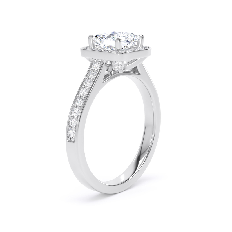 A 1.00 carat lab grown diamond is claw set at the heart of this engagement ring. It is surrounded by a halo of 20 sparkling round brilliant-cut diamonds. The shoulders are set with 16 diamonds total, 8 diamonds per side. The diamonds in the halo and the shoulders are claw set with protective, channel borders to shield them from the impact of daily wear.