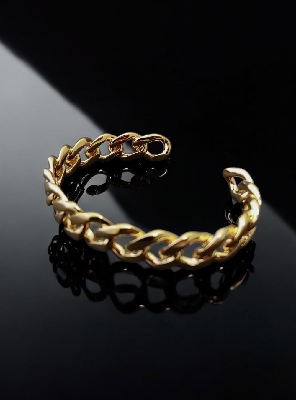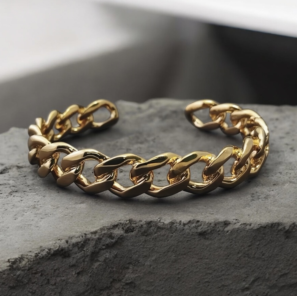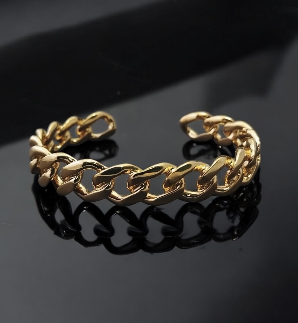 This solid, curb link cuff bangle is a modern twist on the classic curb bracelet.