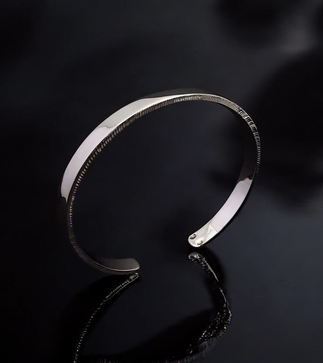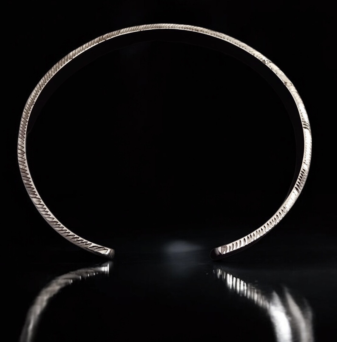 Handcrafted from sterling silver, this polished cuff bangle has decorative, diamond cut detailing on each edge of both sides of the bangle.