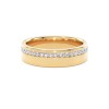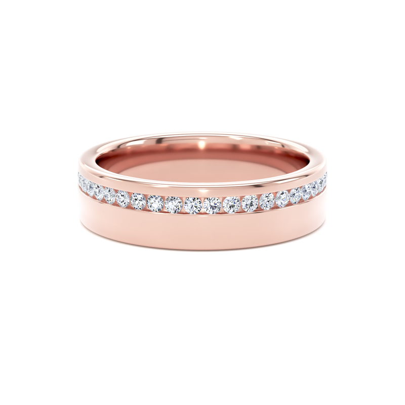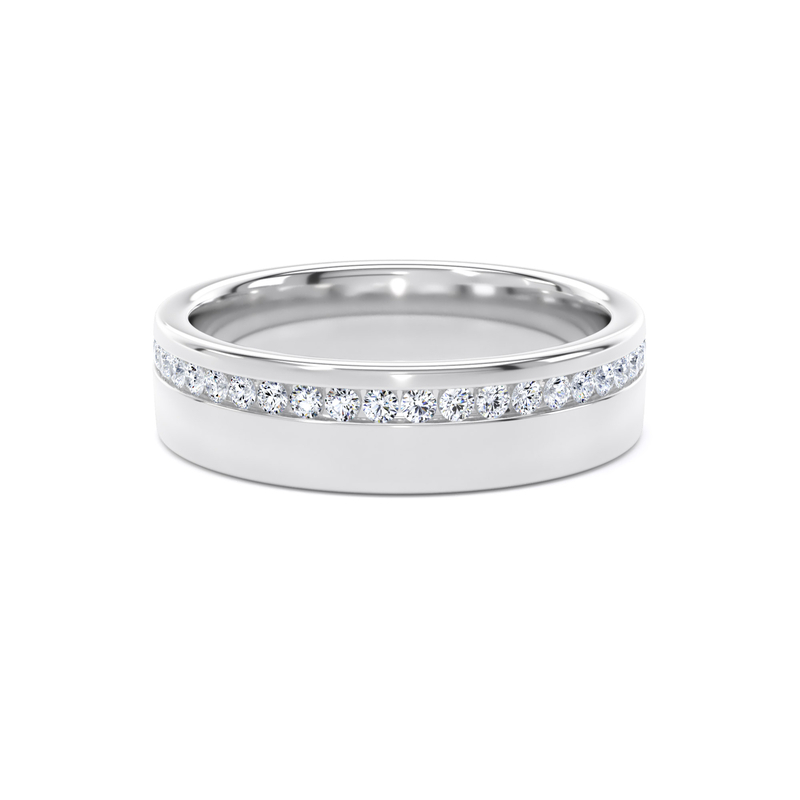 This 5mm wide, flat court profile ring has a diamond set channel, offset from the centre of the band. The round brilliant-cut diamonds are channel set with protective borders to shield them from the impact of daily wear.