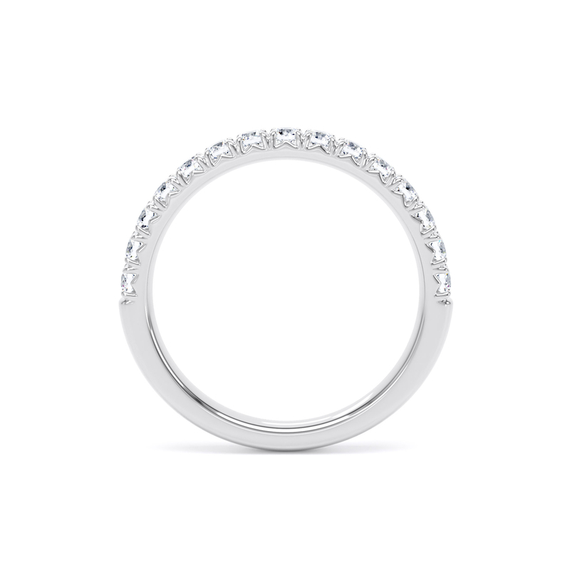 This 2.5mm wide court profile wedding ring is set with 0.50ct of round brilliant cut diamonds. The diamonds are claw set in a decorative, fishtail setting. A subtle ornamental detail that has a big impact.