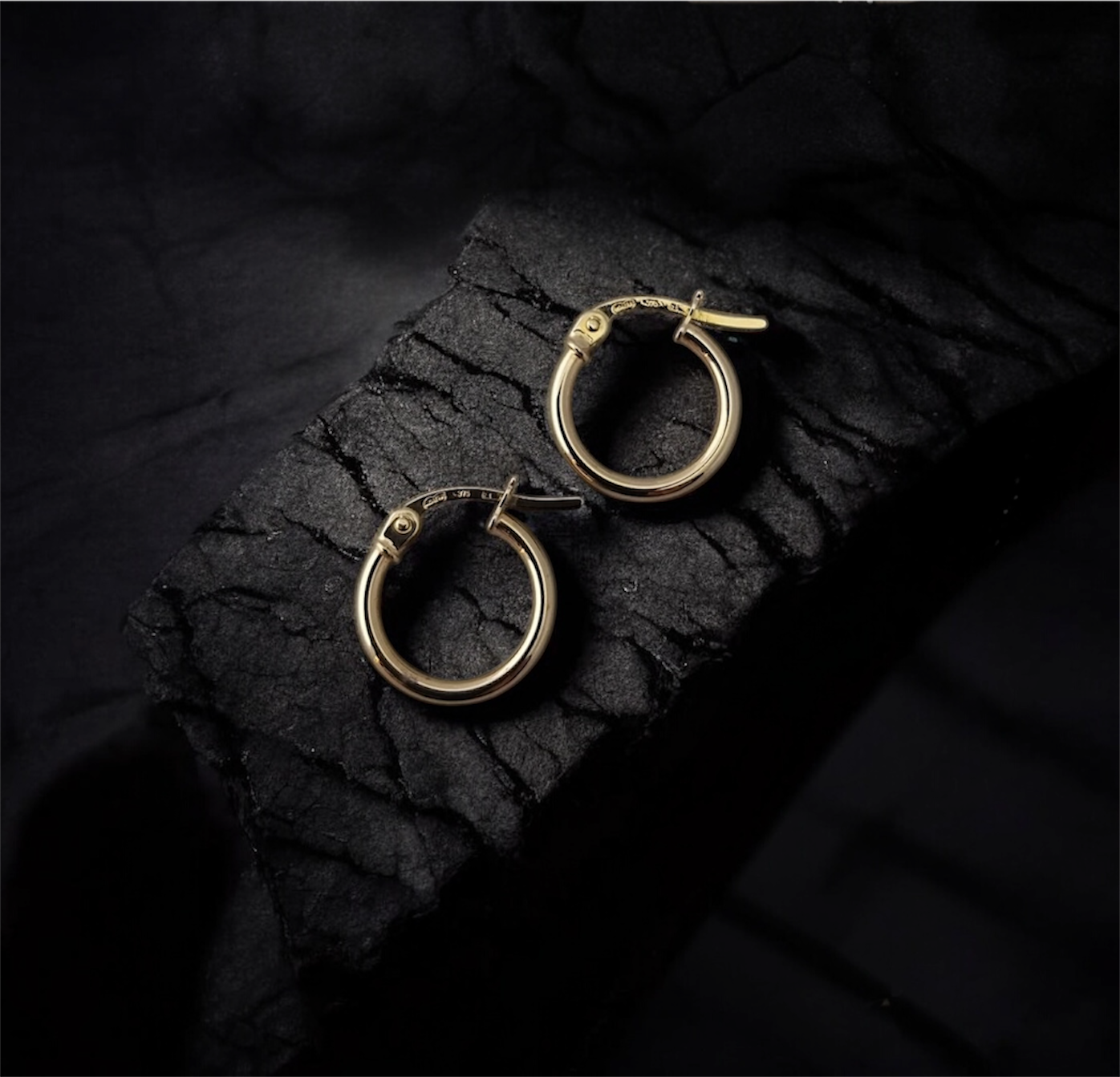 Earrings measure approximately 1.4mm wide and 12mm in diameter.
