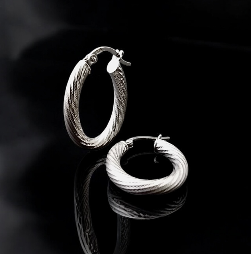 These mid size, 9ct white gold oval creole hoop earrings have a hyper faceted, diamond cut design.
