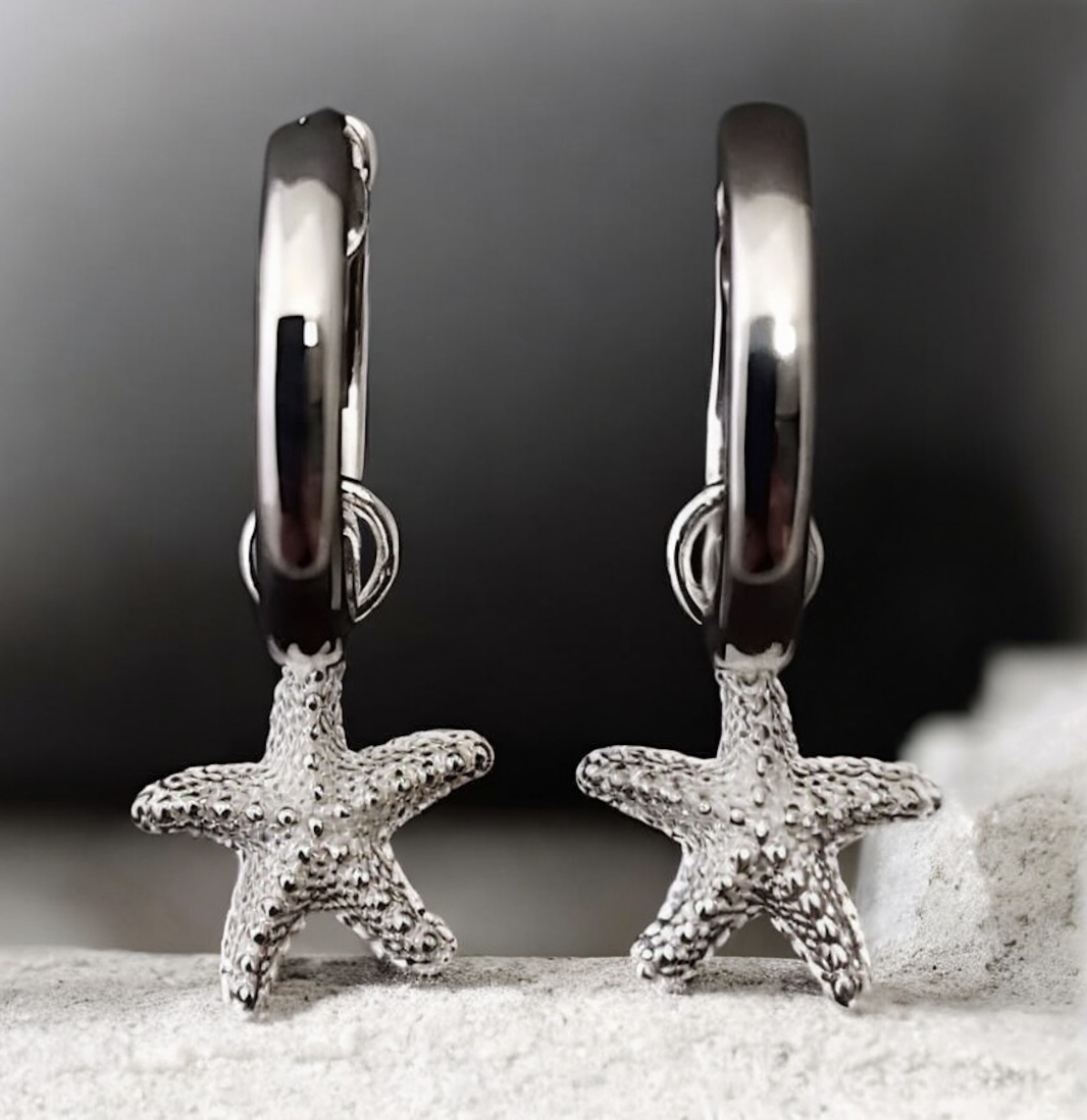 These stylish sterling silver hinged huggie earrings with starfish charms are great worn alone or layered with other earrings to create your own unique ear stack.