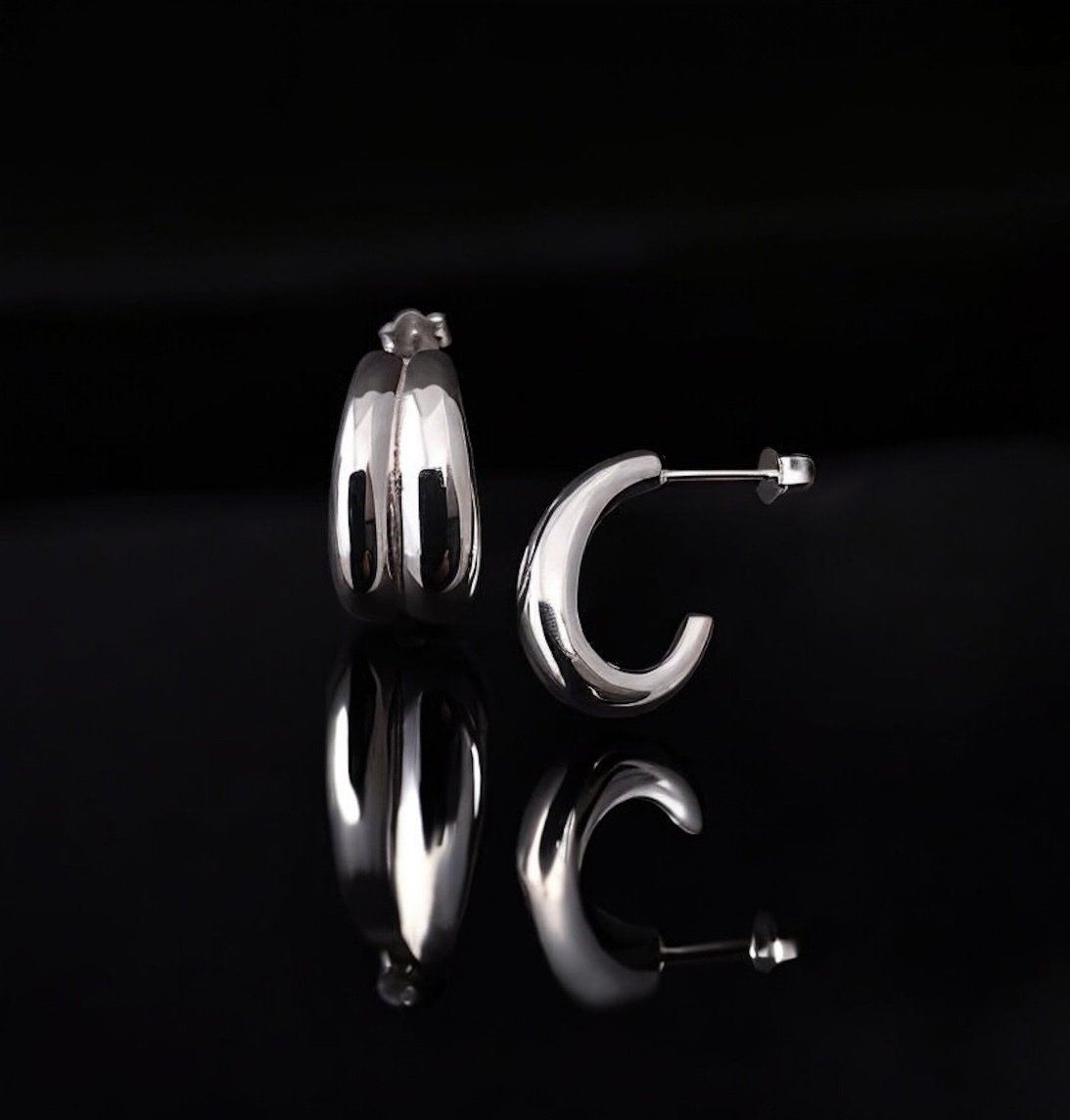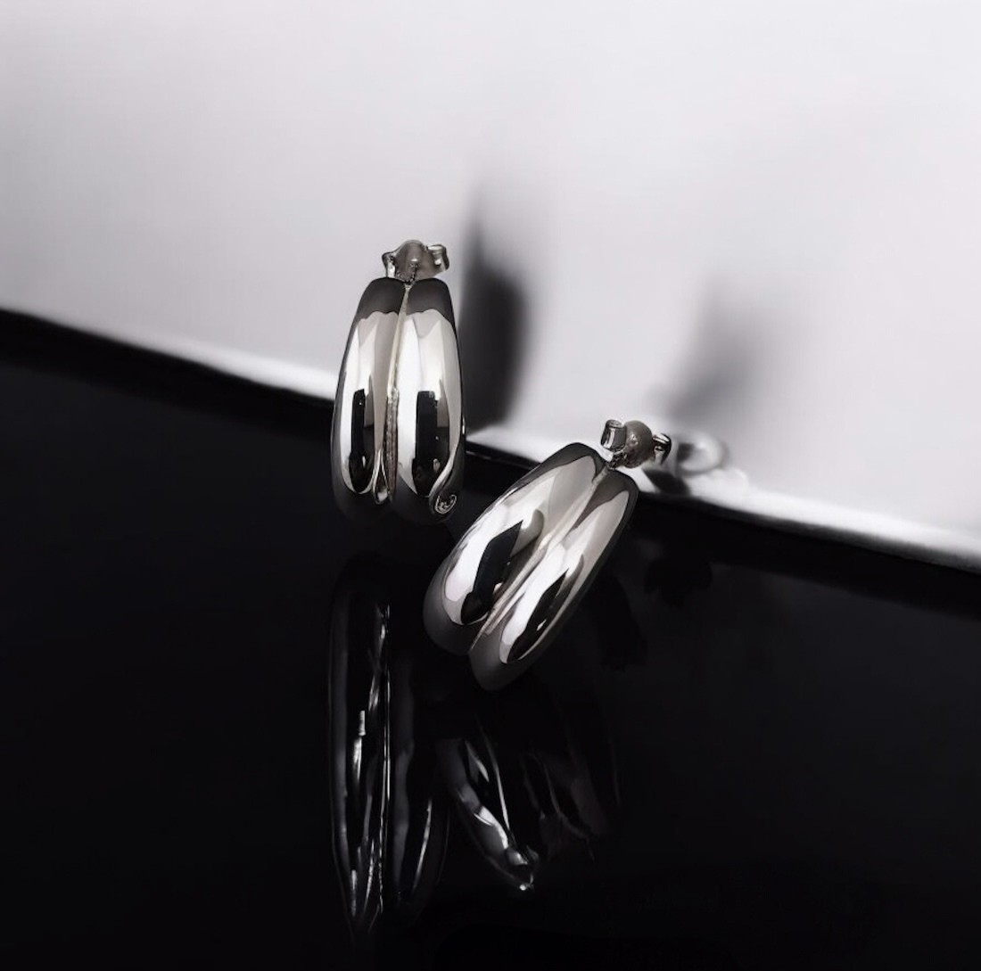 These highly polished sterling silver double huggie half hoops, strike a harmonious balance between stud earring and huggie hoop.