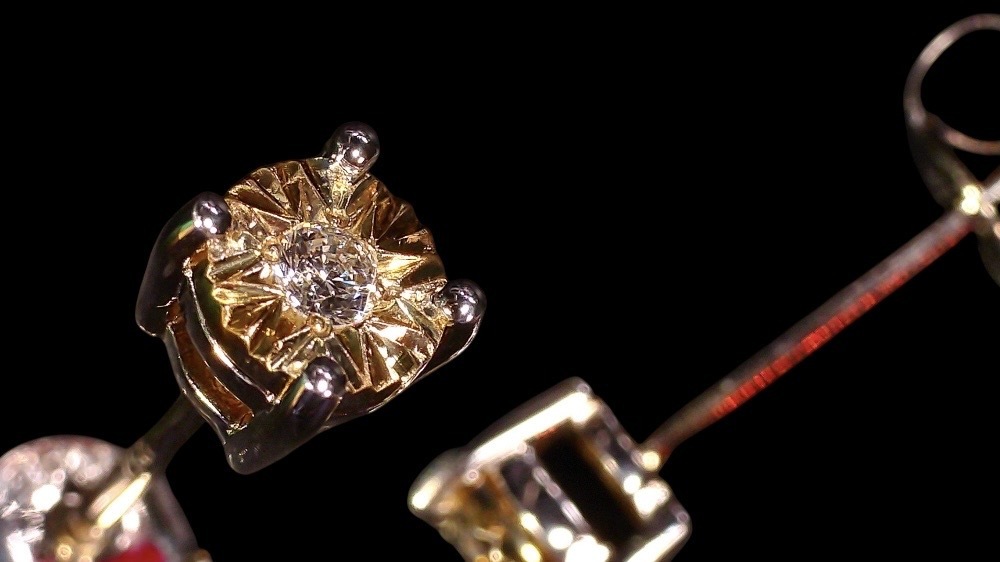 A sparkling lab grown diamond is set at the heart of each stud earring in an 18ct yellow gold illusion-disc. The hand-carved illusion disc is set into an 18ct white gold double gallery 4 claw setting. The combination of white and yellow gold make these earrings a unique and striking choice.