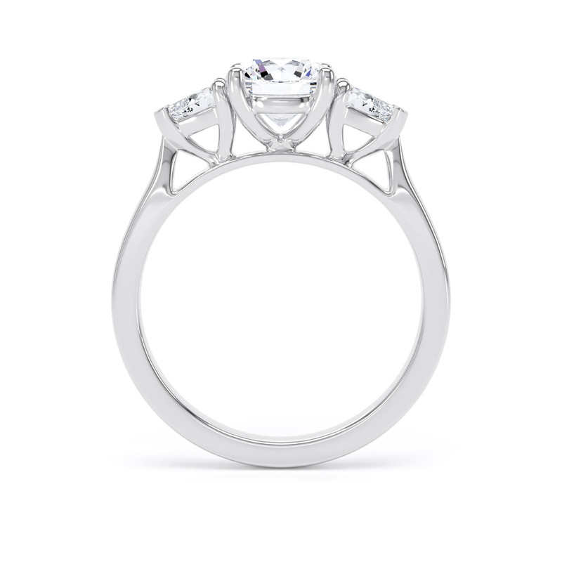 The 0.50 carat natural, round brilliant diamond is at the heart of this ring. It is flanked by two pear shape diamonds.