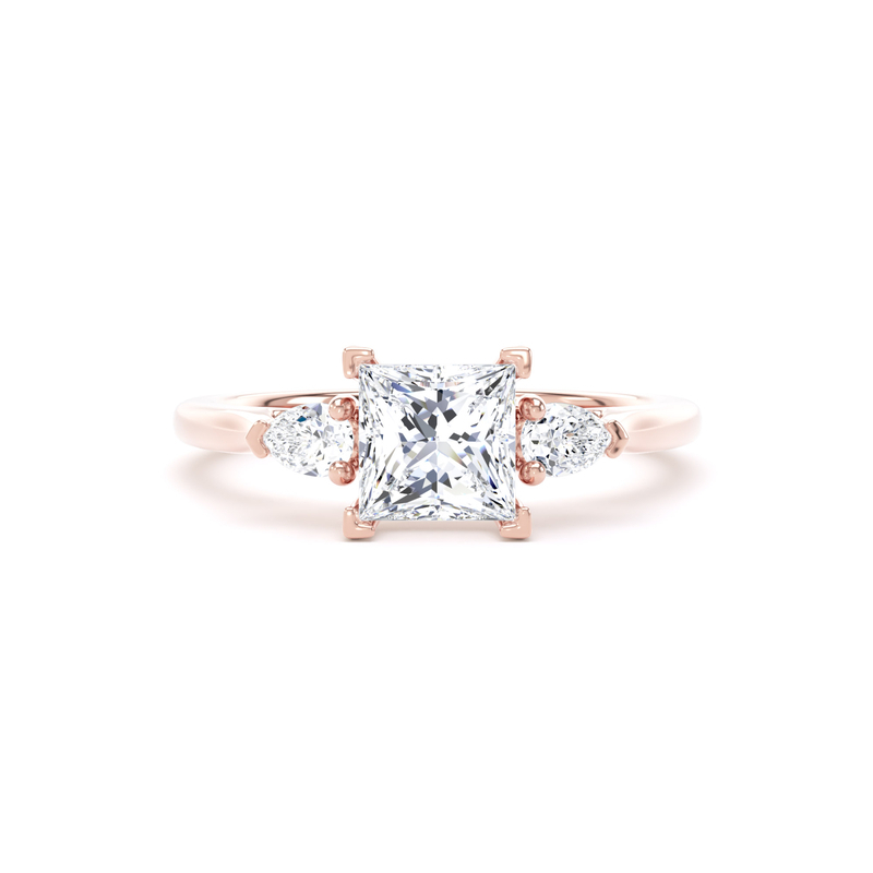 The 0.50 carat lab-grown, princess cut diamond is at the heart of this ring. It is flanked by two pear shape diamonds.