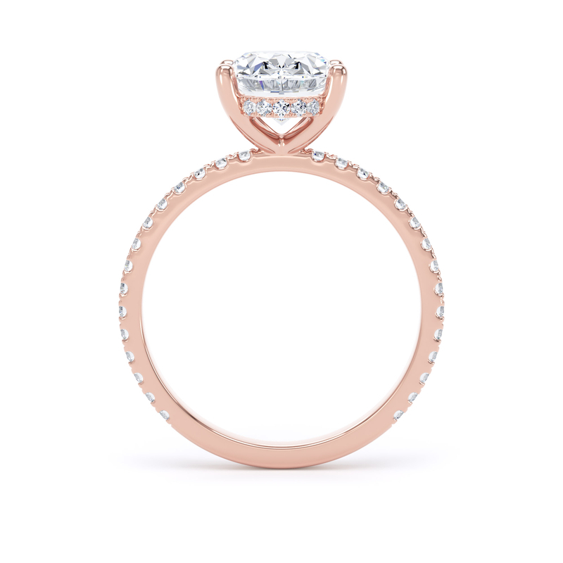 This oval solitaire with diamond set shoulders has a hidden diamond detail.
