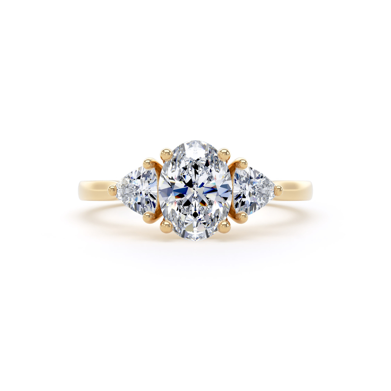 The 0.80 carat natural, oval diamond is at the heart of this ring. It is flanked by two trilliant-cut diamonds.