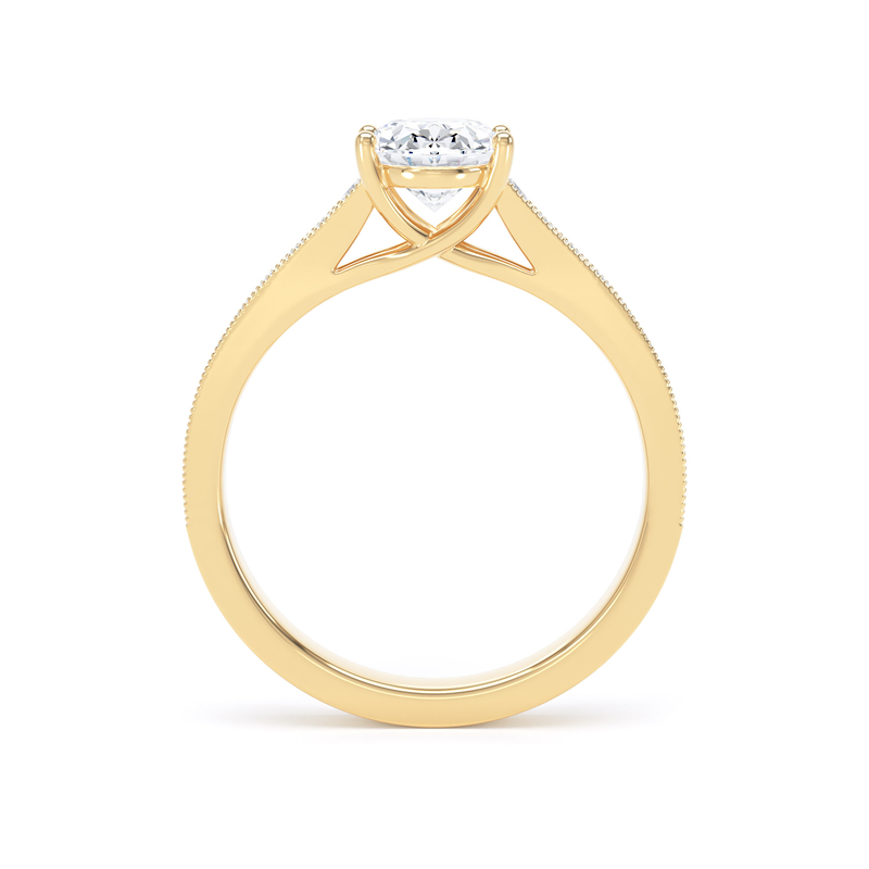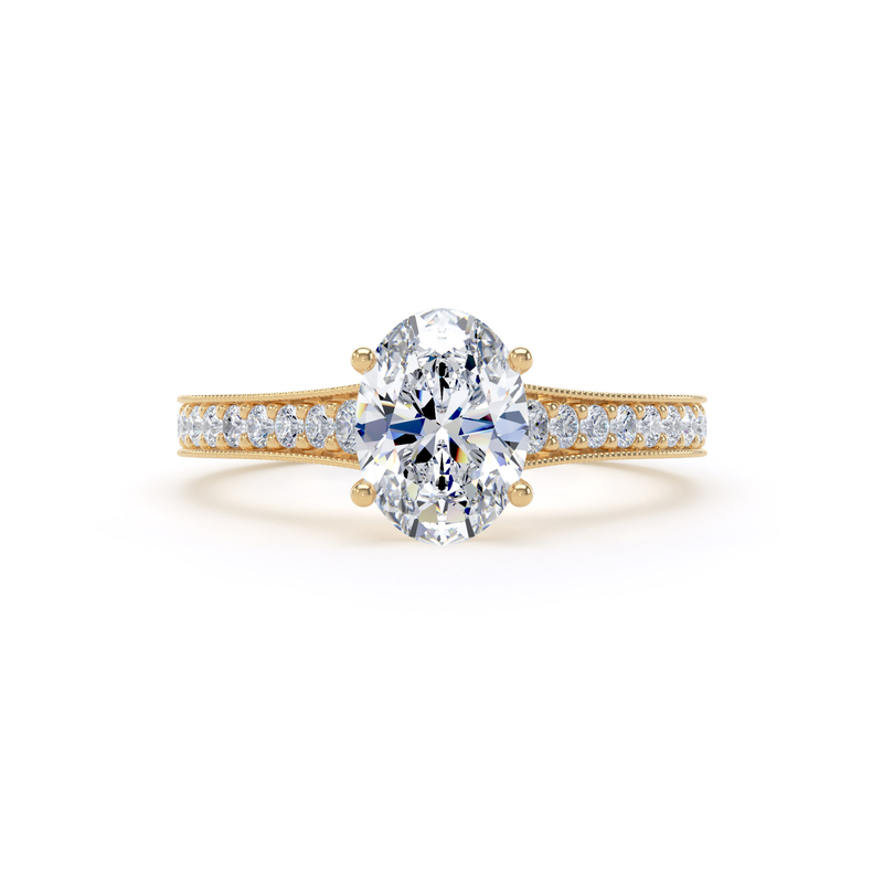 The lab-grown oval diamond is shown off by a four claw setting. The tapered shoulders are diamond set and the mille-grain border adds delicate charm.