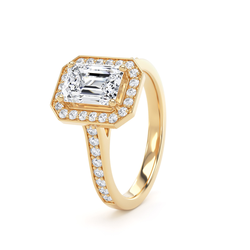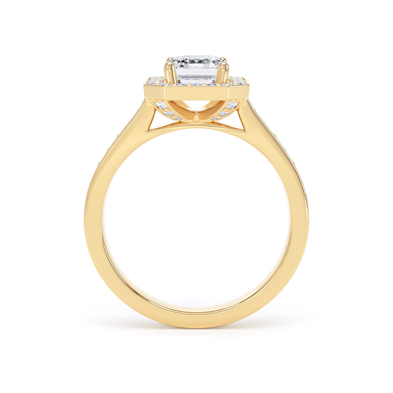 A 1.53 carat lab-grown emerald diamond is at the heart of this engagement ring. It is surrounded by a halo of 22 round brilliant cut diamonds. The shoulders are set with 16 diamonds, with 8 each side of the emerald halo.