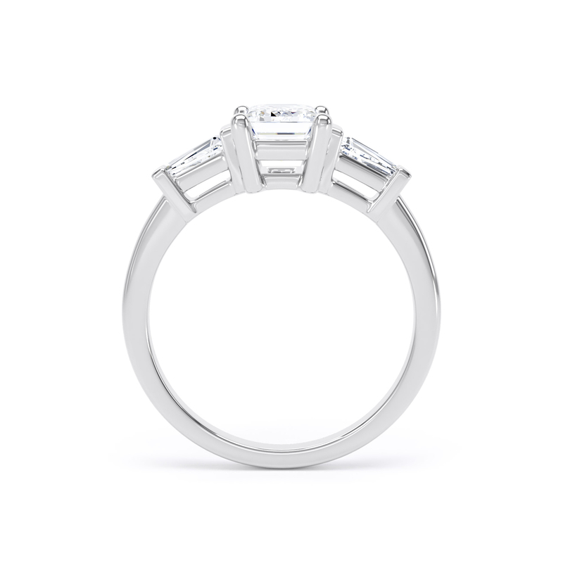 This opulent diamond trilogy ring has a central emerald cut diamond, flanked by two horizontally set, tapered baguette-cut diamonds. The finished ring is bold but beautiful.