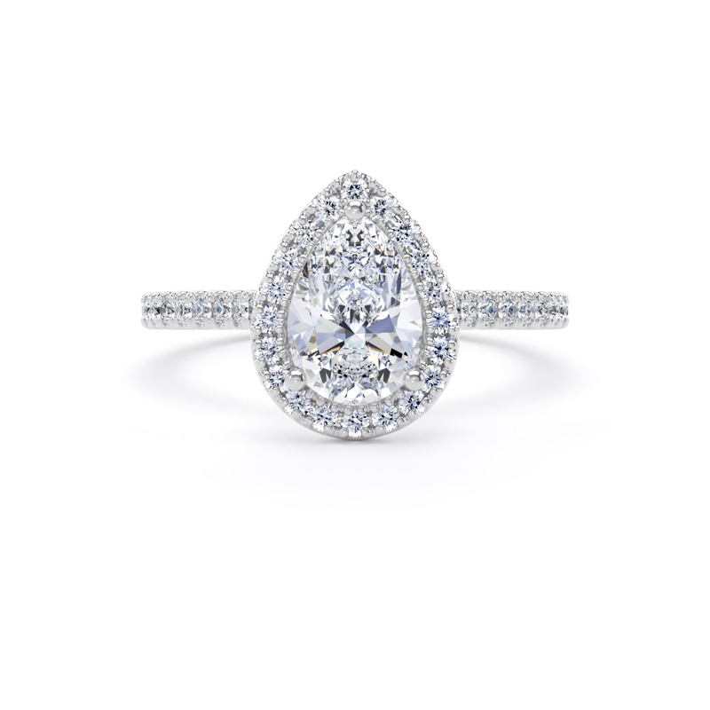 A 1.00 carat lab grown, pear shape diamond is at the heart of this ring. It is surrounded by a halo of round brilliant cut diamonds and has 20 sparkling diamonds set into the shoulders, 10 each side of the halo.