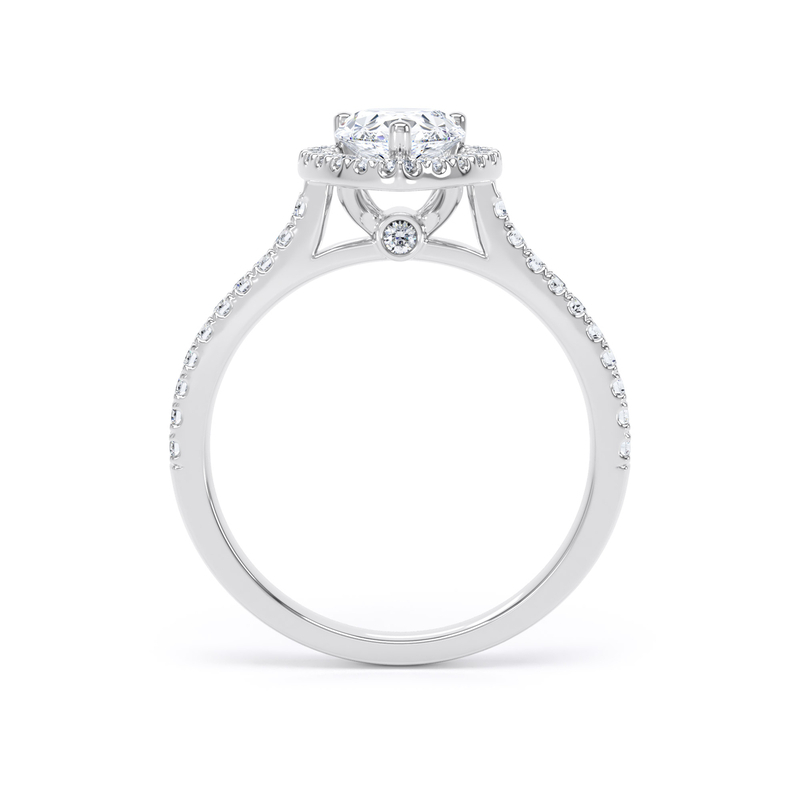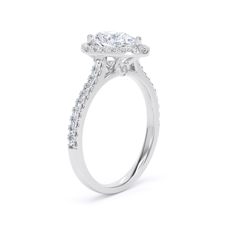 Pear shape halo with diamond set shoulders and hidden diamond detail