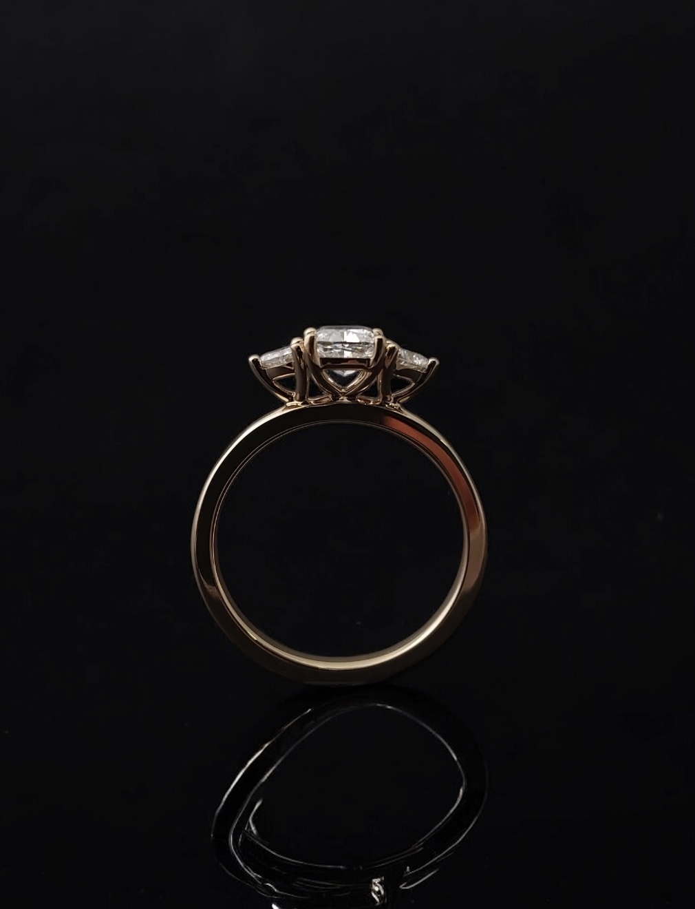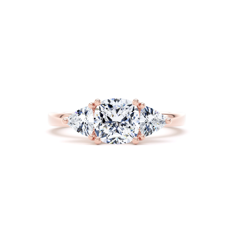 The 0.50 carat natural, cushion cut diamond is at the heart of this ring. It is flanked by two trilliant-cut diamonds.