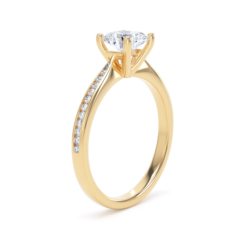 The natural, cushion cut diamond is at the heart of this ring set in a four claw setting. The tapered, channel set shoulders are set with 24 diamonds, 12 sparkling diamonds in each of the shoulders.