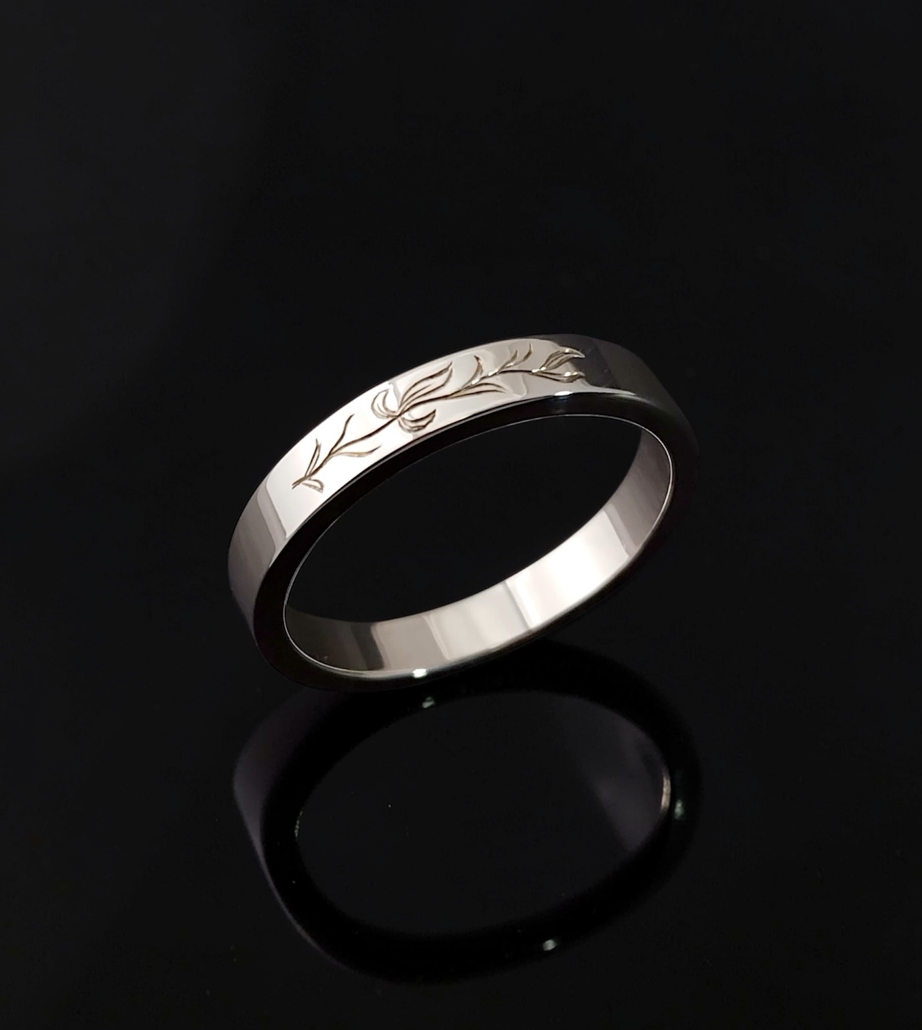 Flat profile band measures approximately 1.4mm D x 3mm W.