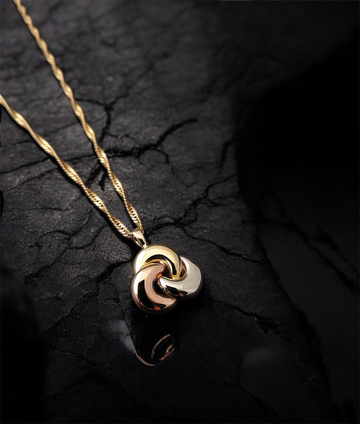 This tri colour knot pendant is made from 9ct yellow, white and rose gold.
