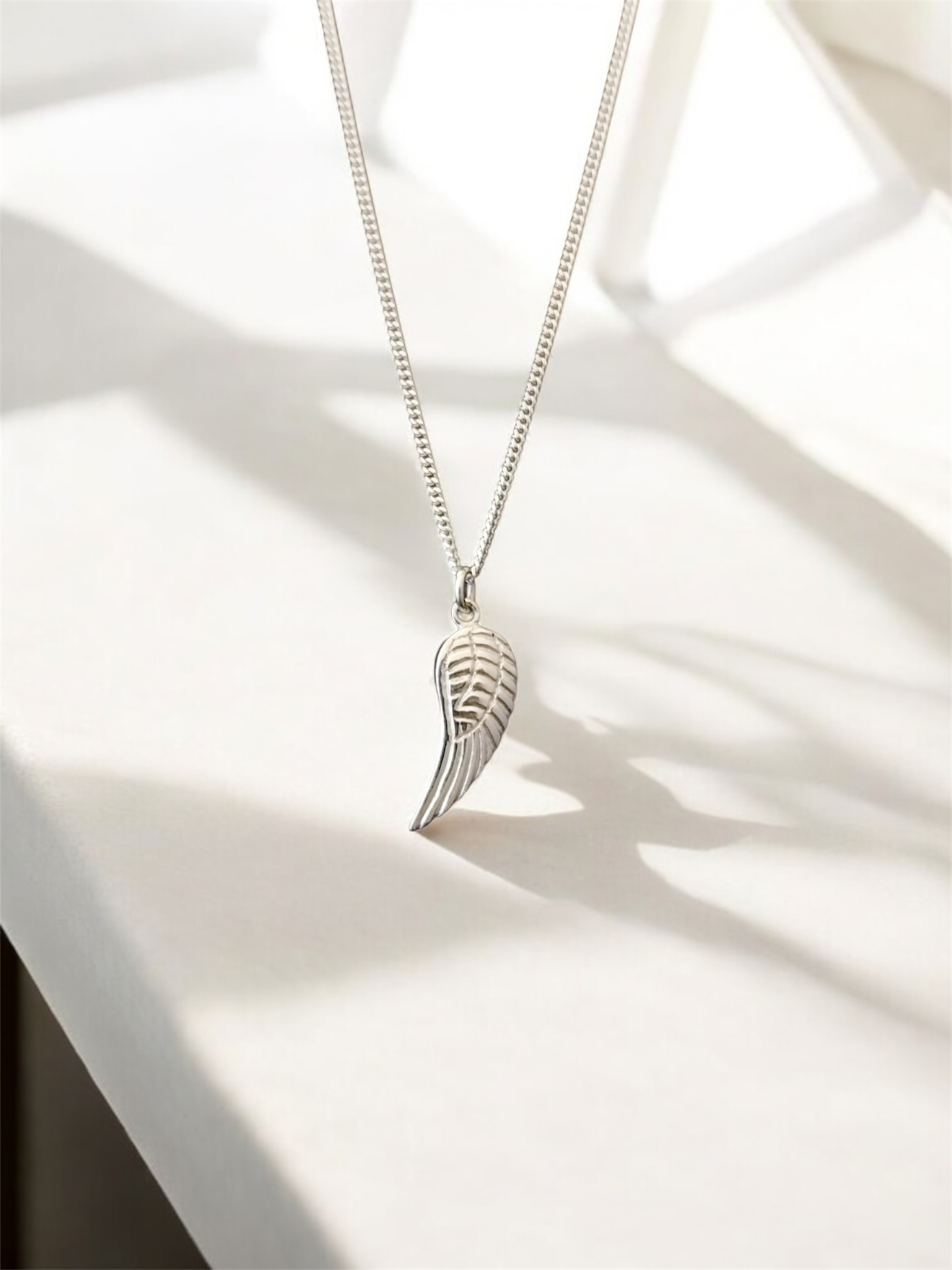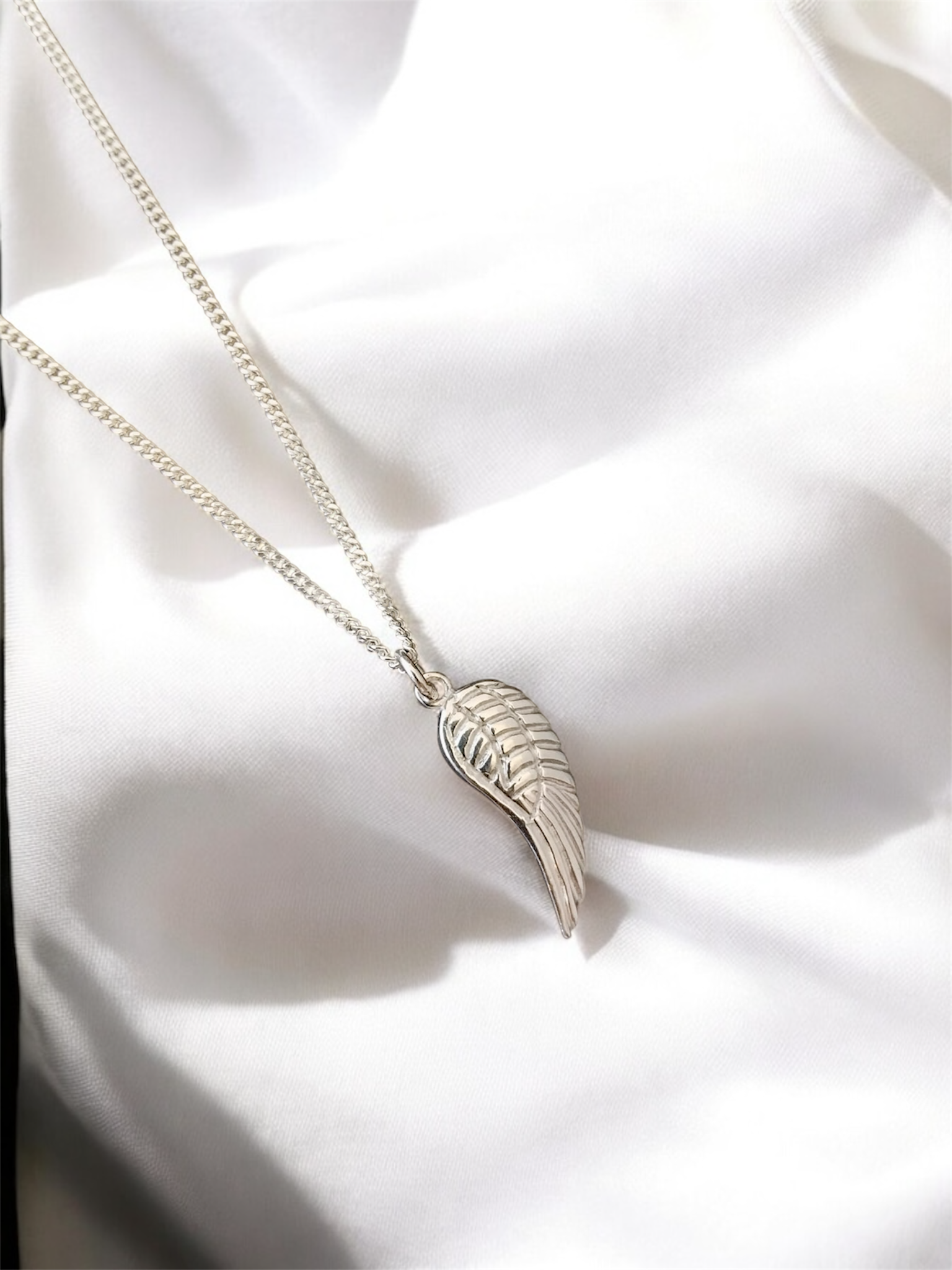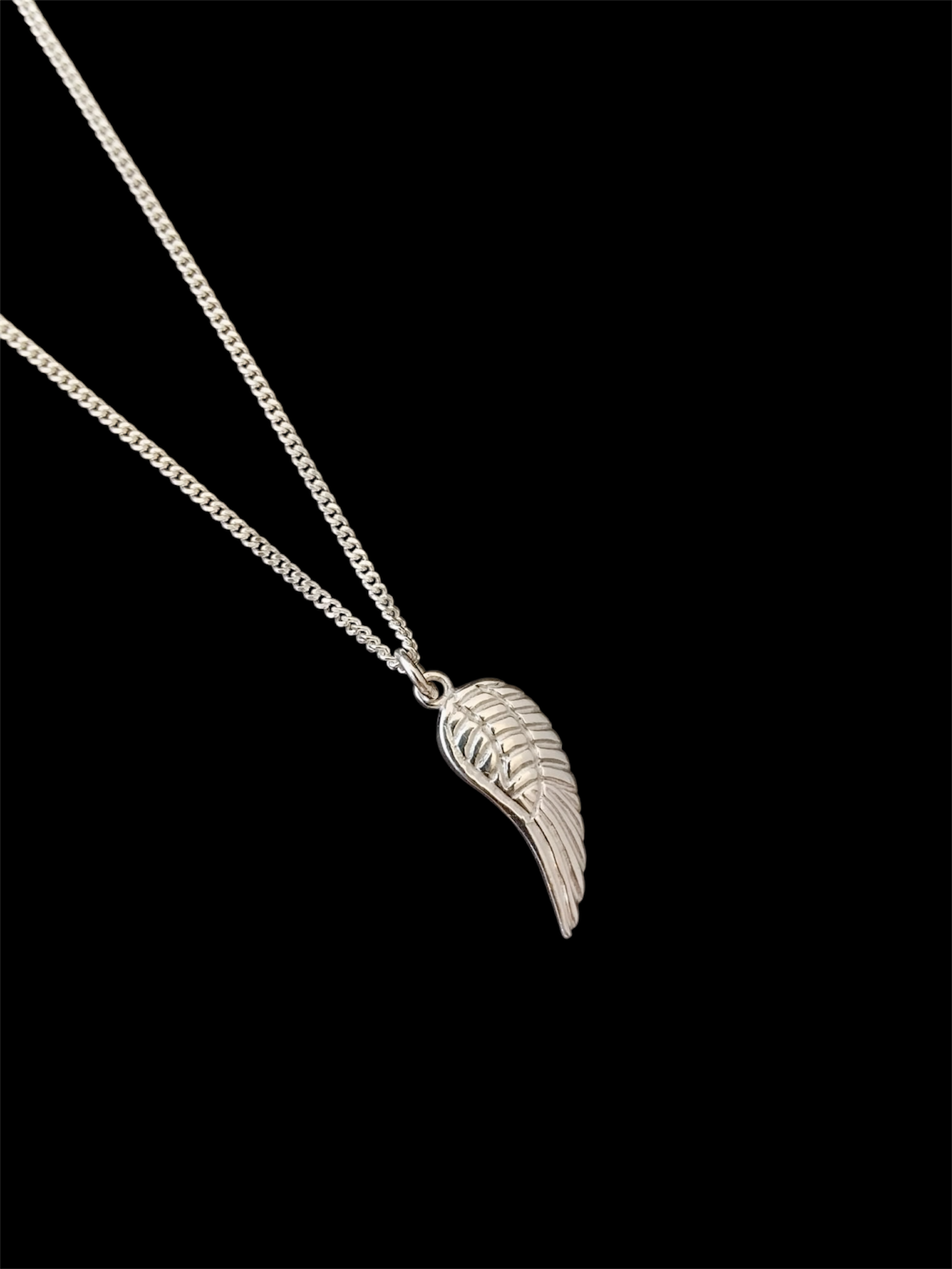 This sterling silver angel wing pendant has intricate feather detailing on the wing.