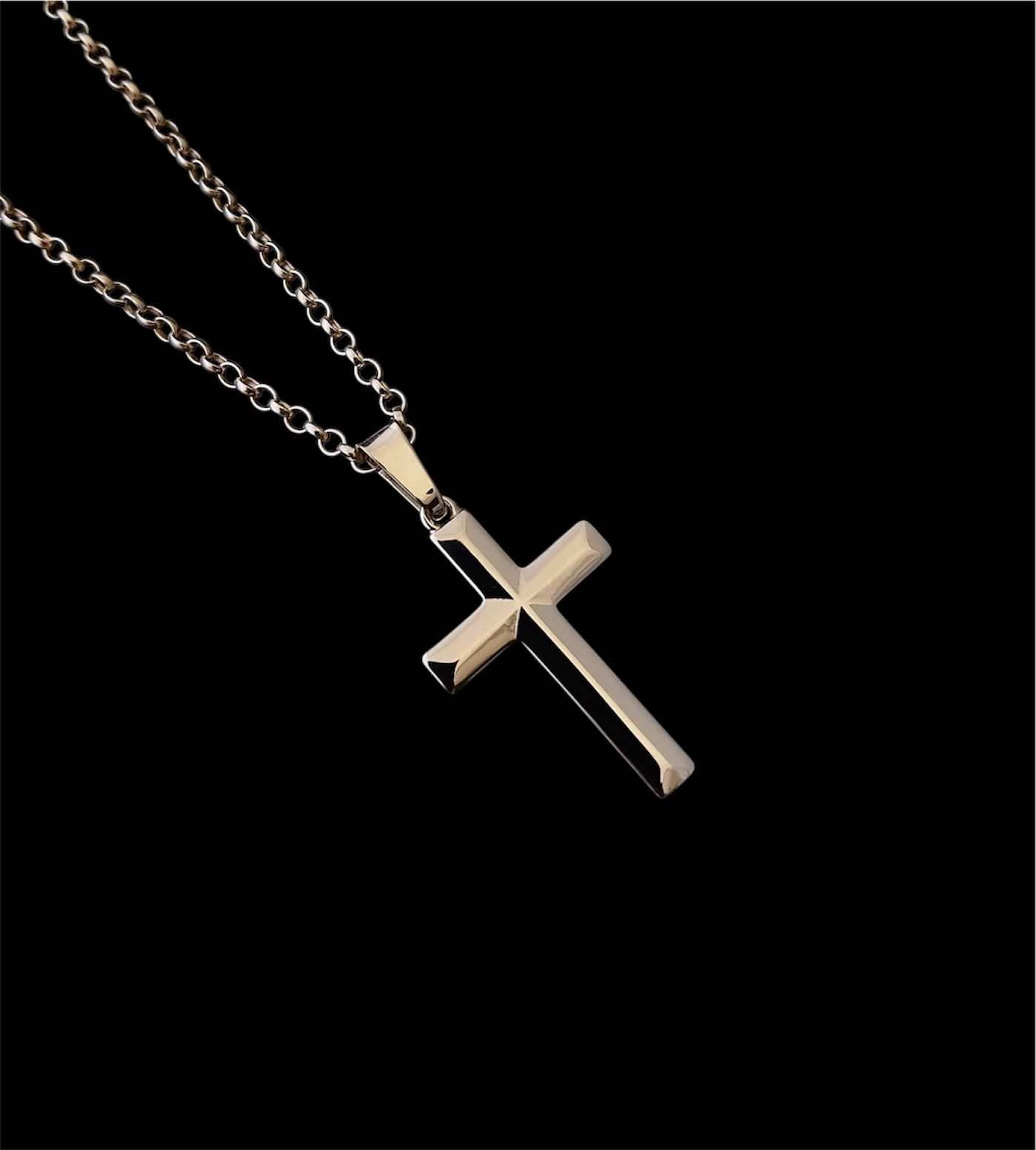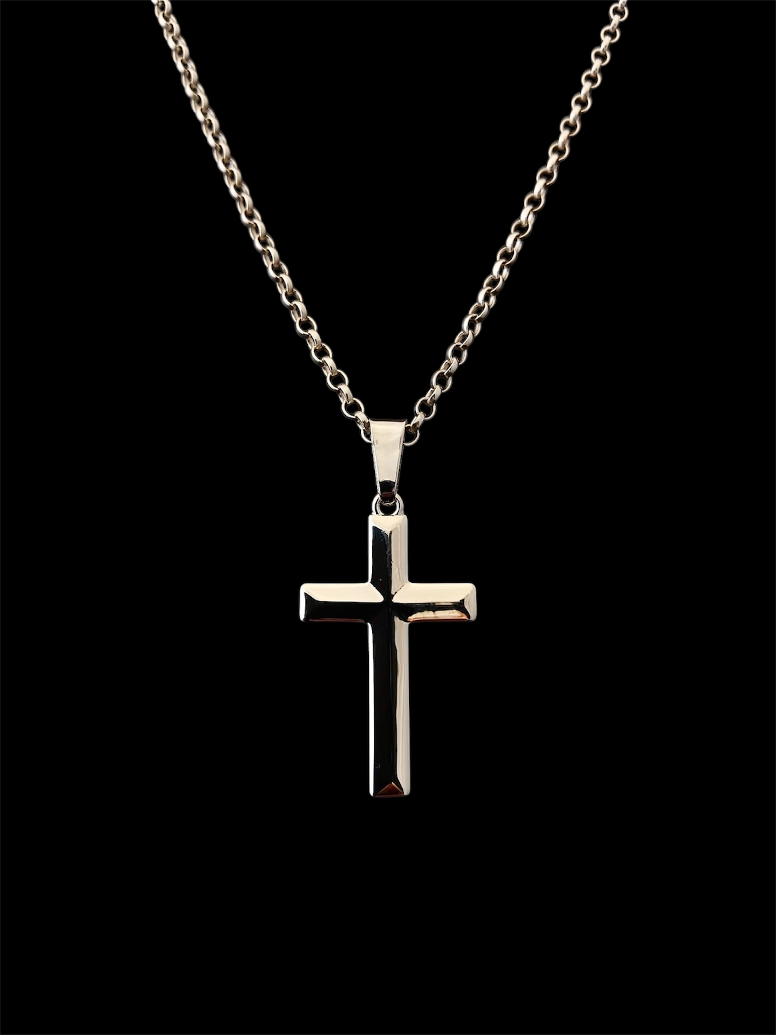 This sterling silver cross pendant has striking bevelled edges to reflect both light and shade.