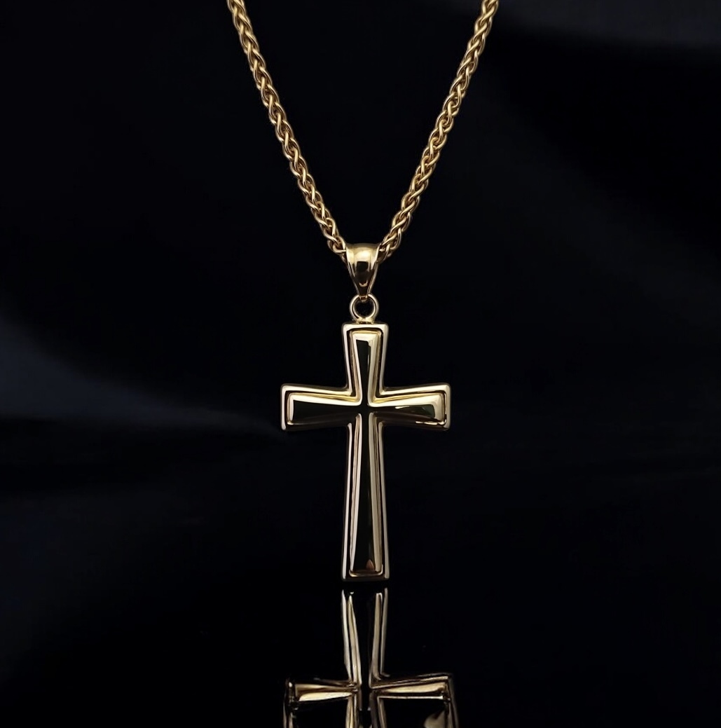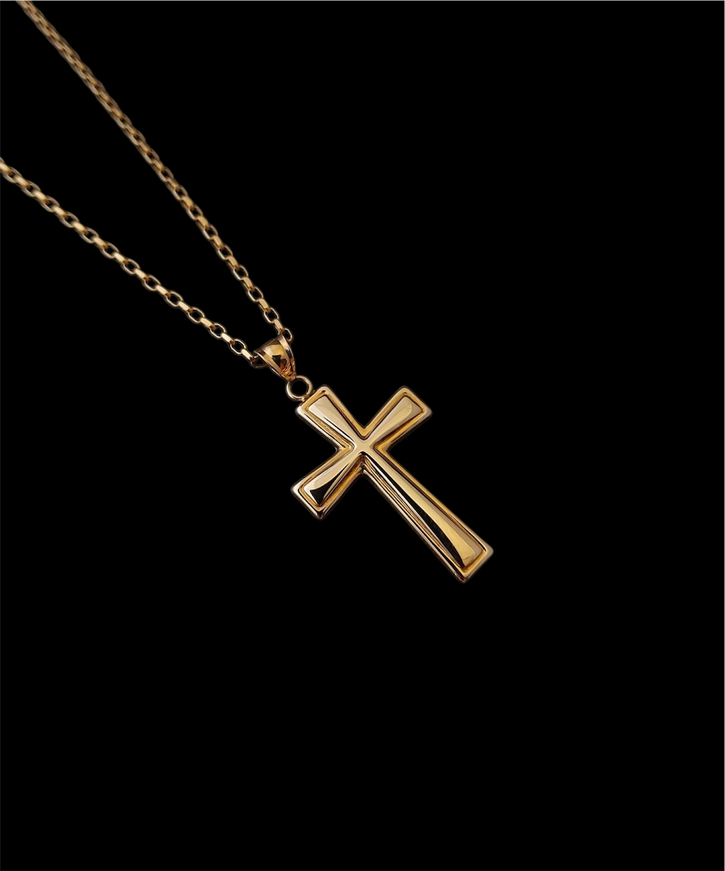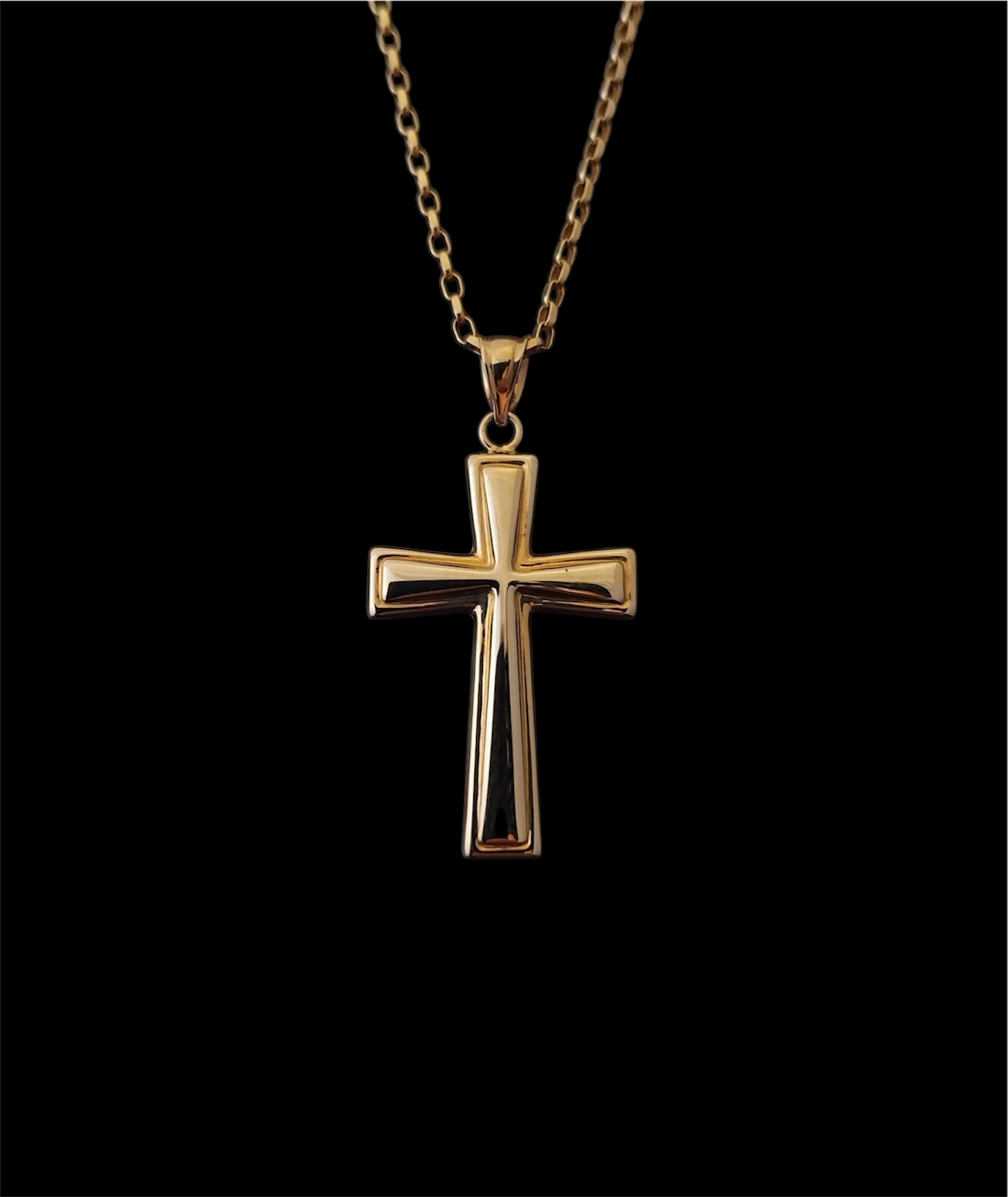 This 9ct yellow gold cross pendant has striking bevelled edges to reflect both light and shade.