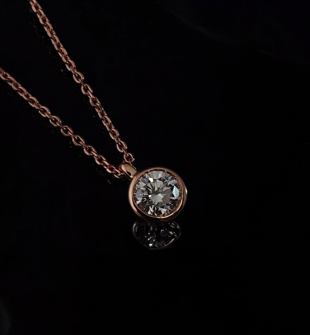This modern diamond solitaire necklace is handcrafted from solid 9ct rose gold.