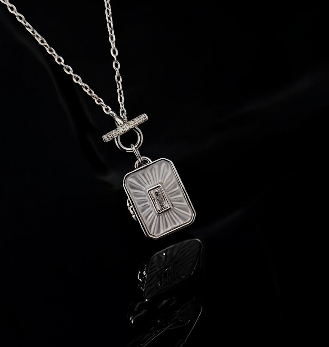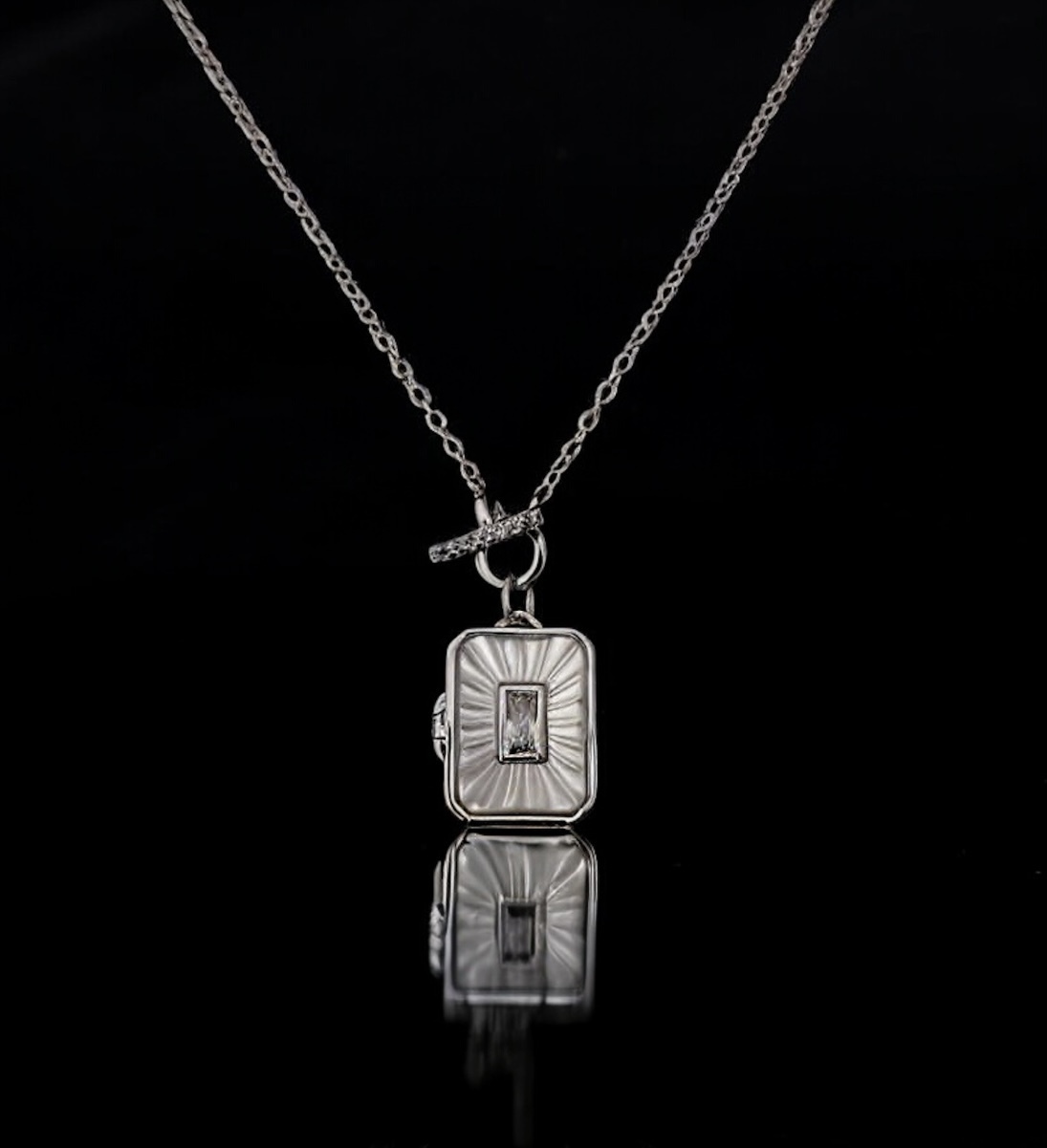 A rectangular-cut cubic zirconia gemstone is set at the heart of this locket and surrounded by Mother of Pearl inlay. The contemporary T-bar is set with sparkling cubic zirconia gemstones.