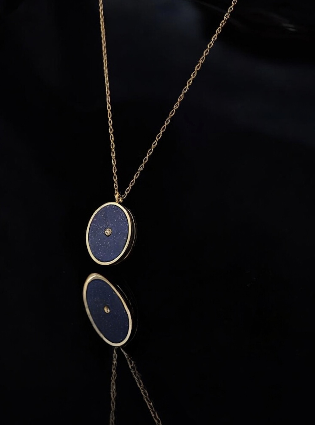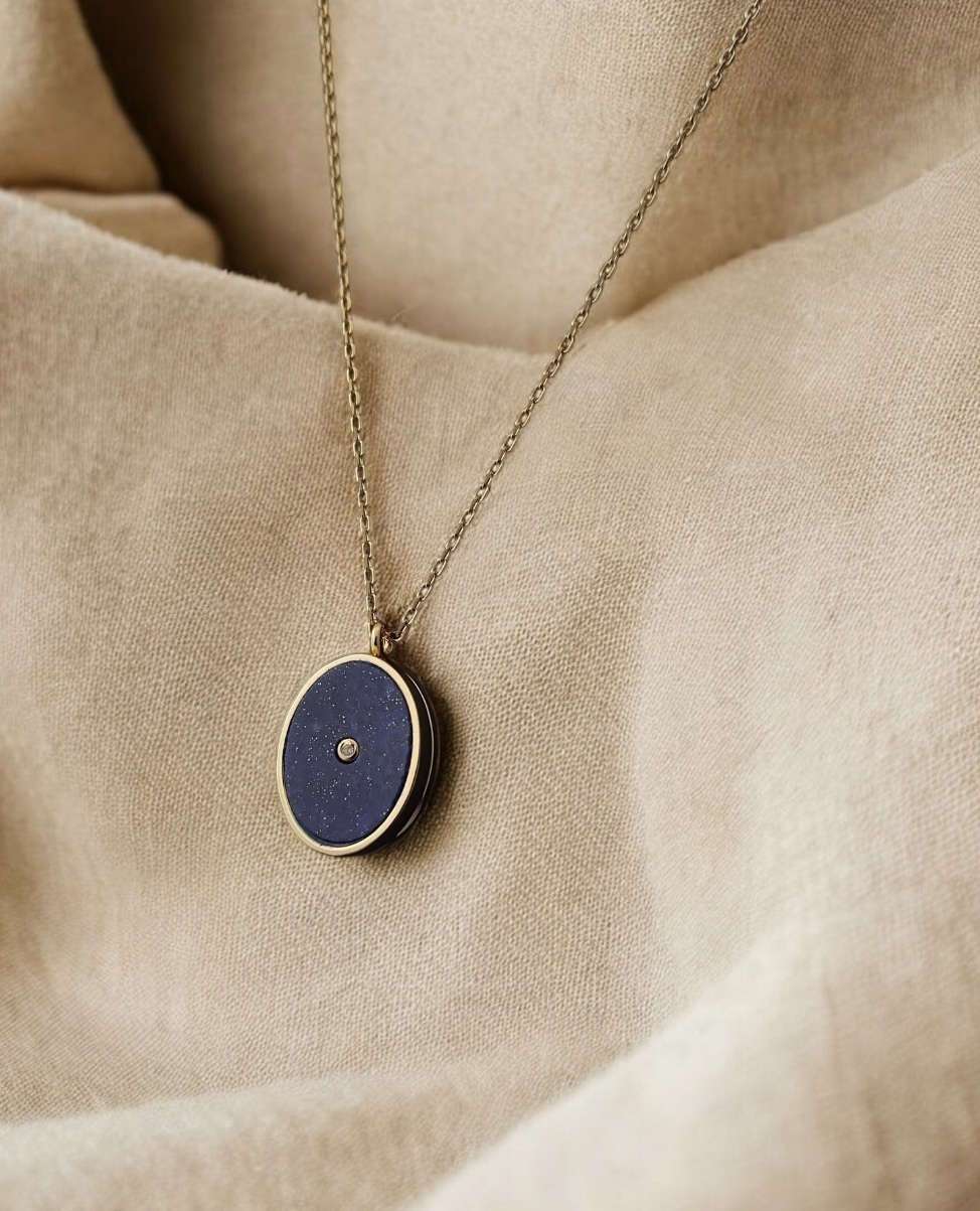 A cubic zirconia gemstone is set at the heart of this locket and surrounded by Lapis lazuli inlay.