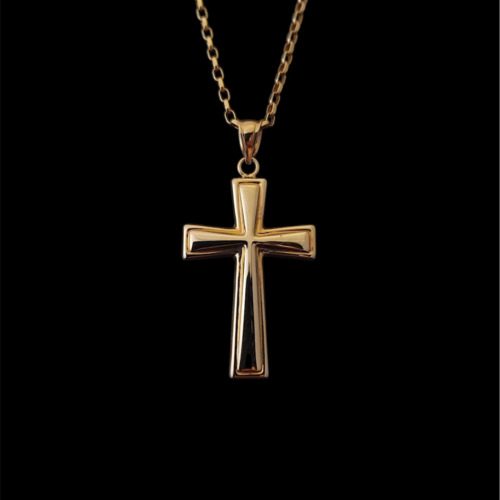 This 9ct yellow gold cross pendant has striking bevelled edges…