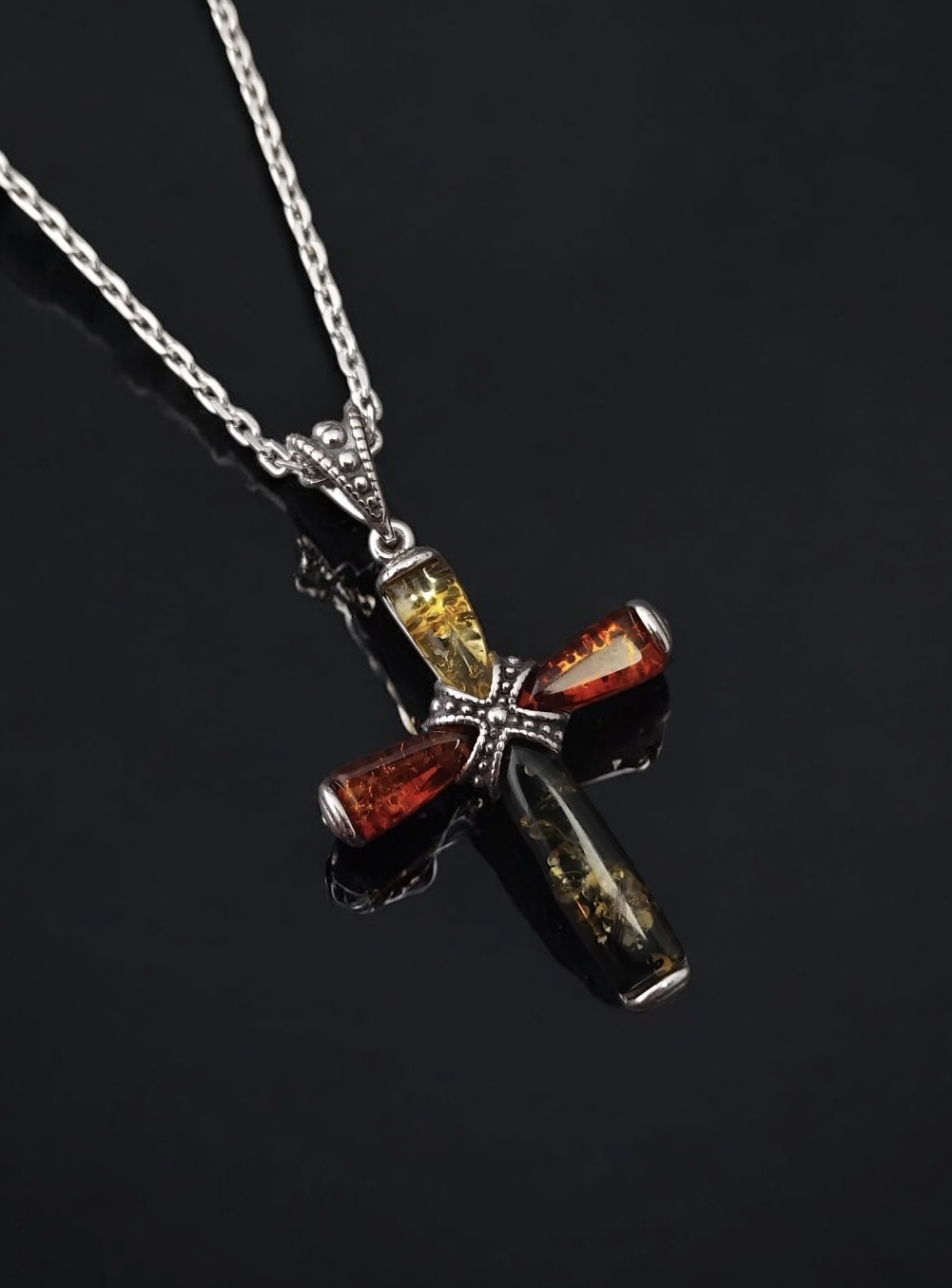 The centre and bale of the cross have ornamental sterling silver beading, tying the elements together.