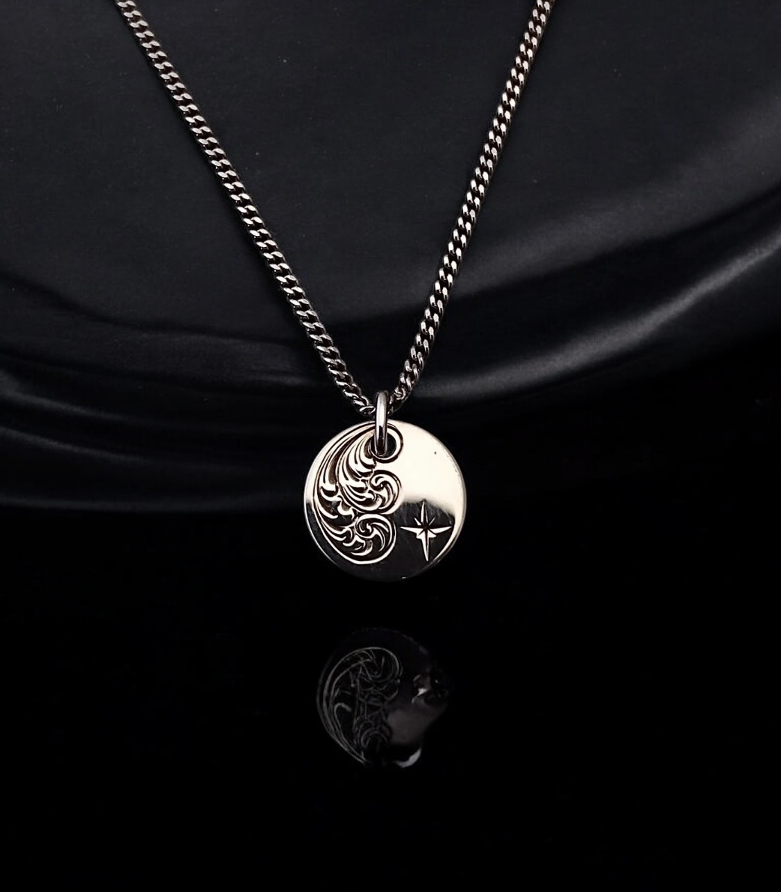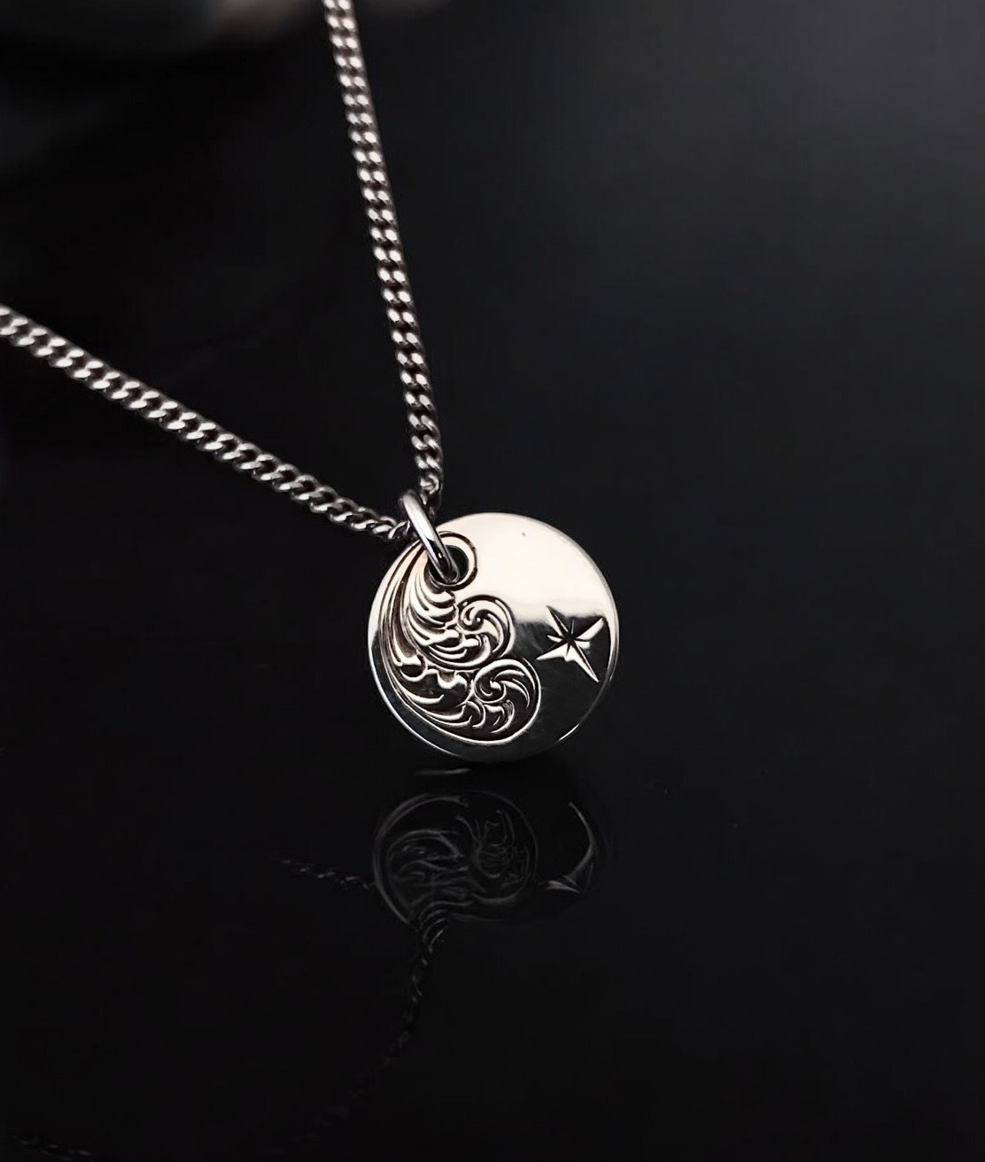 The North sea pendant is hand engraved with scroll work depicting crests of several waves breaking beneath the watchful North star.
