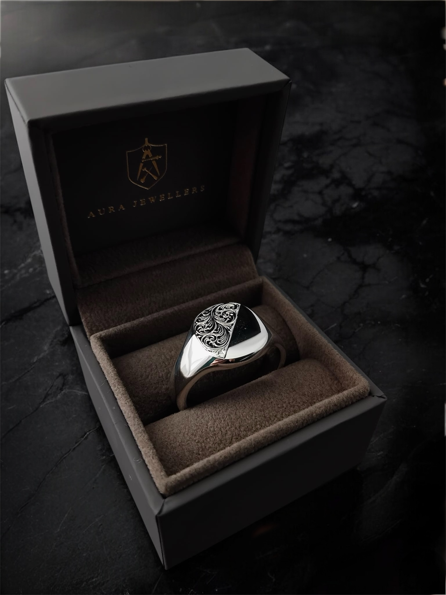Designed to be worn either way around, one half has a highly polished finish, whilst the other half boasts traditional, English scrollwork.