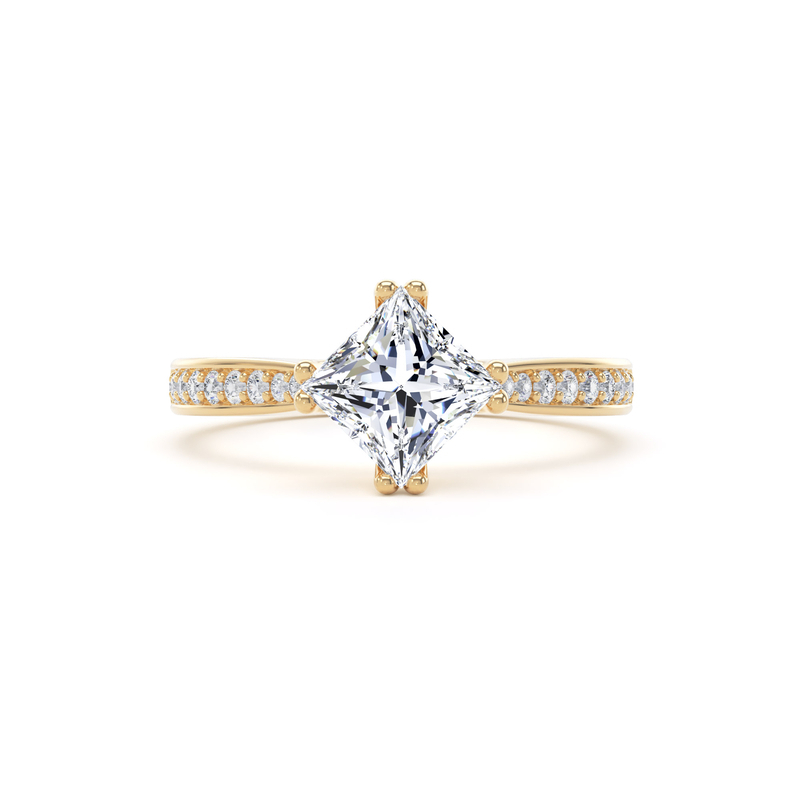The natural, princess cut diamond is set at North, South, East, West orientation. The highly polished split, swept shoulders taper towards the head to accentuate the pretty, double claw accents of the setting. The shoulders are set with 20 sparkling diamonds, 10 per side.
