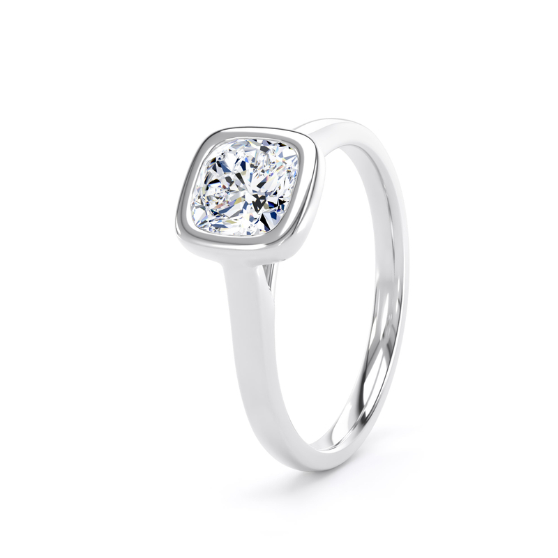 The cushion cut diamond is set in a secure, rubover setting making it the ideal choice for someone with an active lifestyle. The highly polished plain shoulders and sleek lines let the 2.10 carat diamond do all the talking!