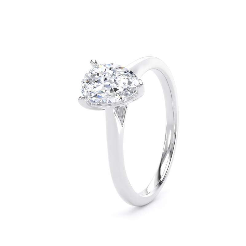 Set in a three claw setting, with a combination of both talon and picture frame style claws, this pear shape diamond engagement ring can be worn either way around. The highly polished split, swept shoulders taper towards the setting to let the 0.75ct diamond do all the talking! The result is a classical engagement ring with understated elegance.