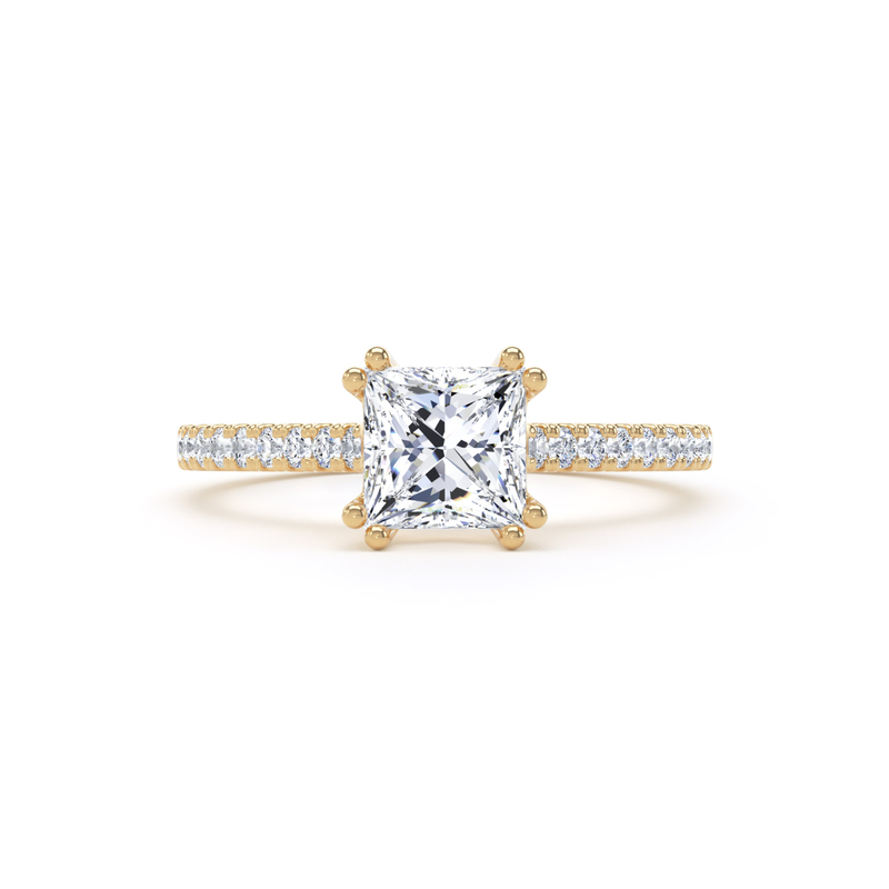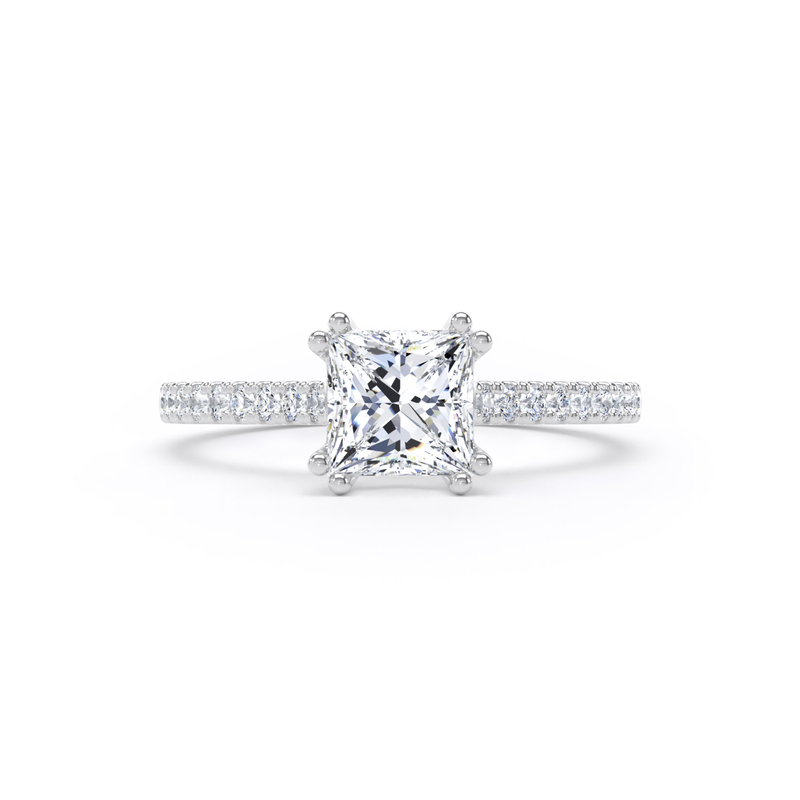 A 0.50ct princess cut diamond is set in an attractive, double claw setting at the heart of this ring.