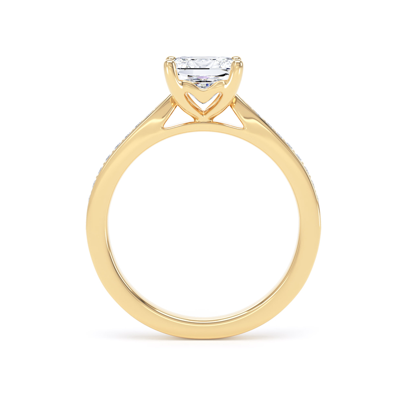 A 0.60ct princess cut diamond is claw set at the heart of this ring.