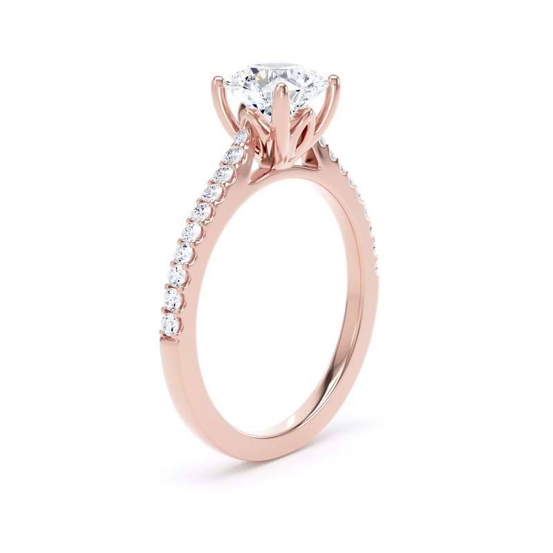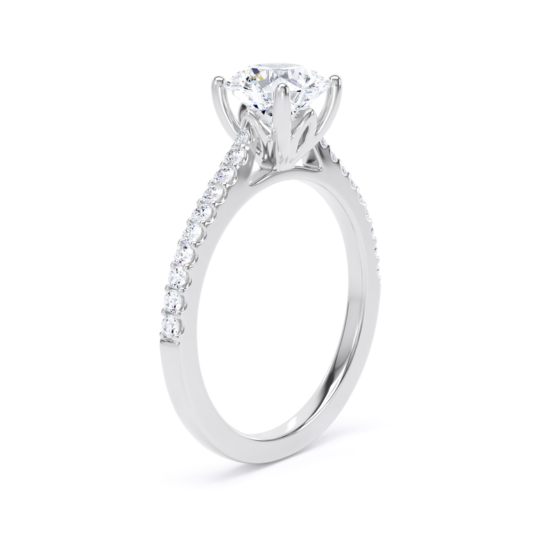 A 1.00ct round brilliant cut diamond is at the heart of this ring. The four claw setting holding the diamond has pretty petal accents. The shoulders are claw set with 10 diamonds per side making this ring sparkle.