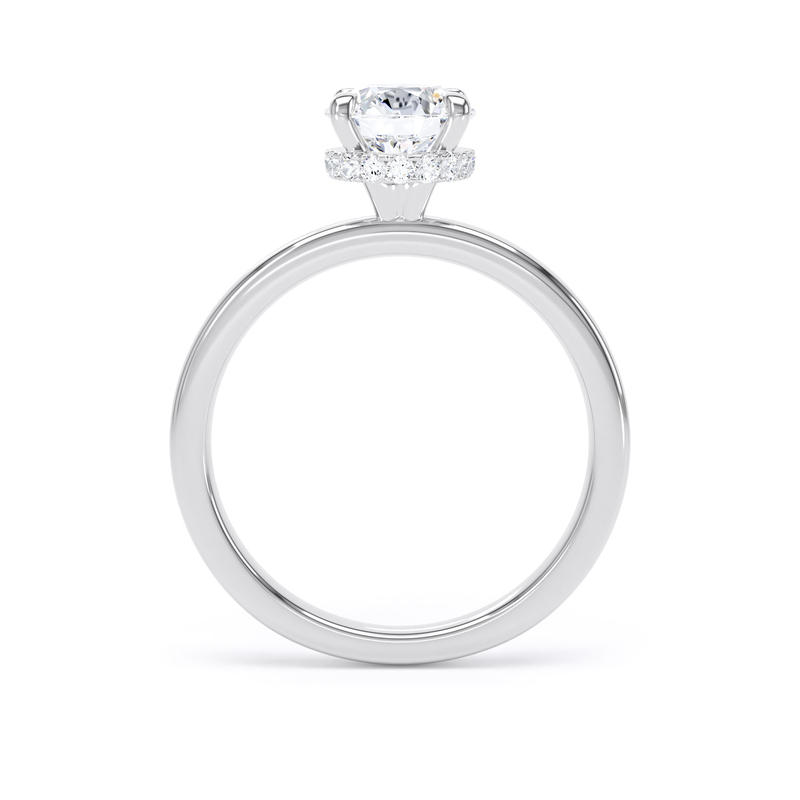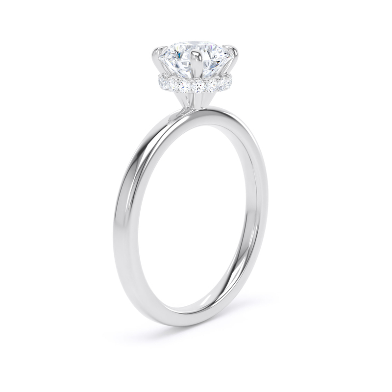 Look a little closer and you will see a sparkling halo of hidden diamonds surrounds the base of the four claw setting, obscured at first glance.