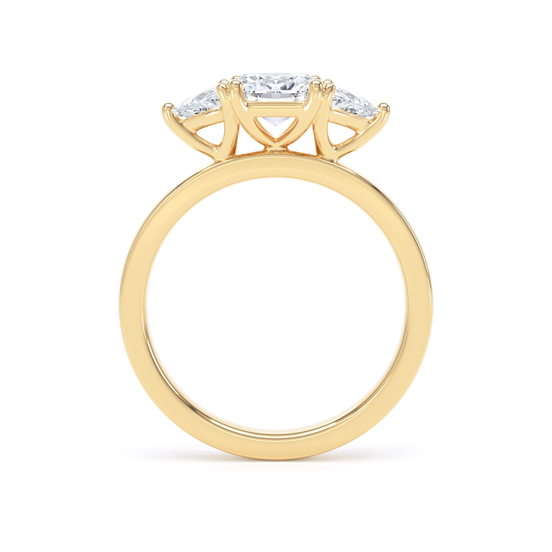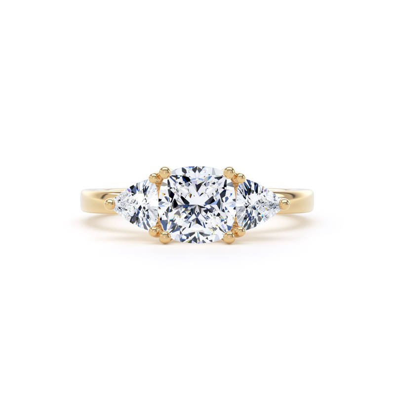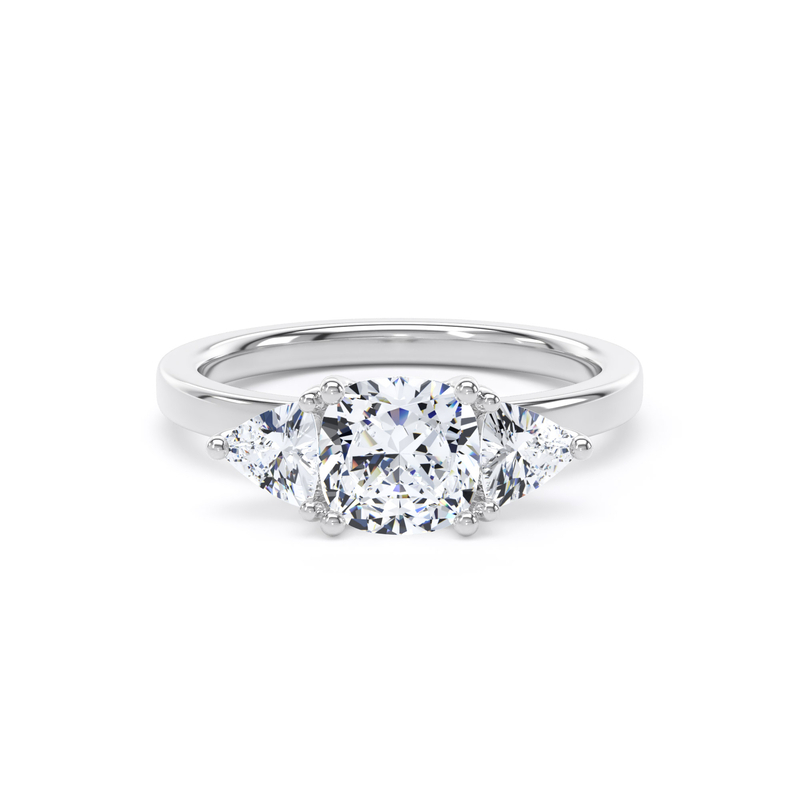 This opulent diamond trilogy ring is set with a 0.50 carat natural, cushion cut diamond at the heart of this ring. It is flanked by two trilliant-cut diamonds.