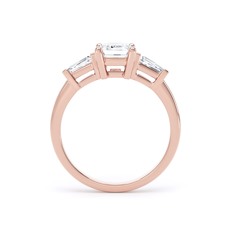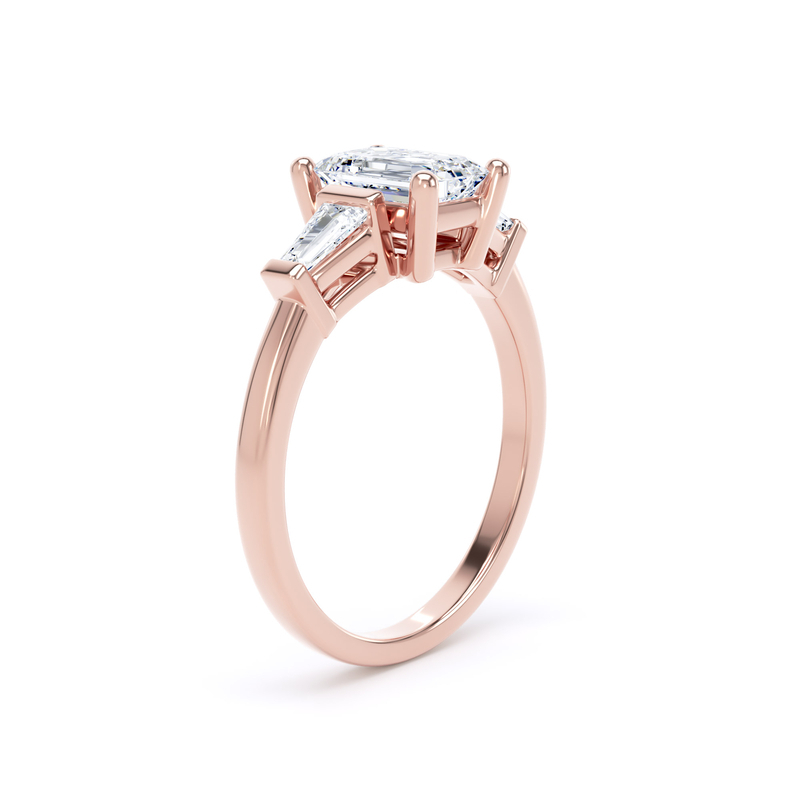 A 1.00 carat lab grown, emerald cut diamond is at the heart of this ring. It is flanked by two tapered baguette cut diamonds.